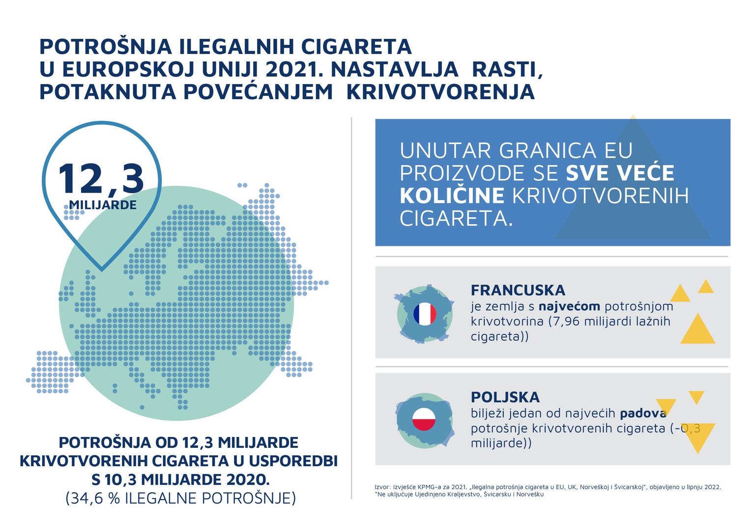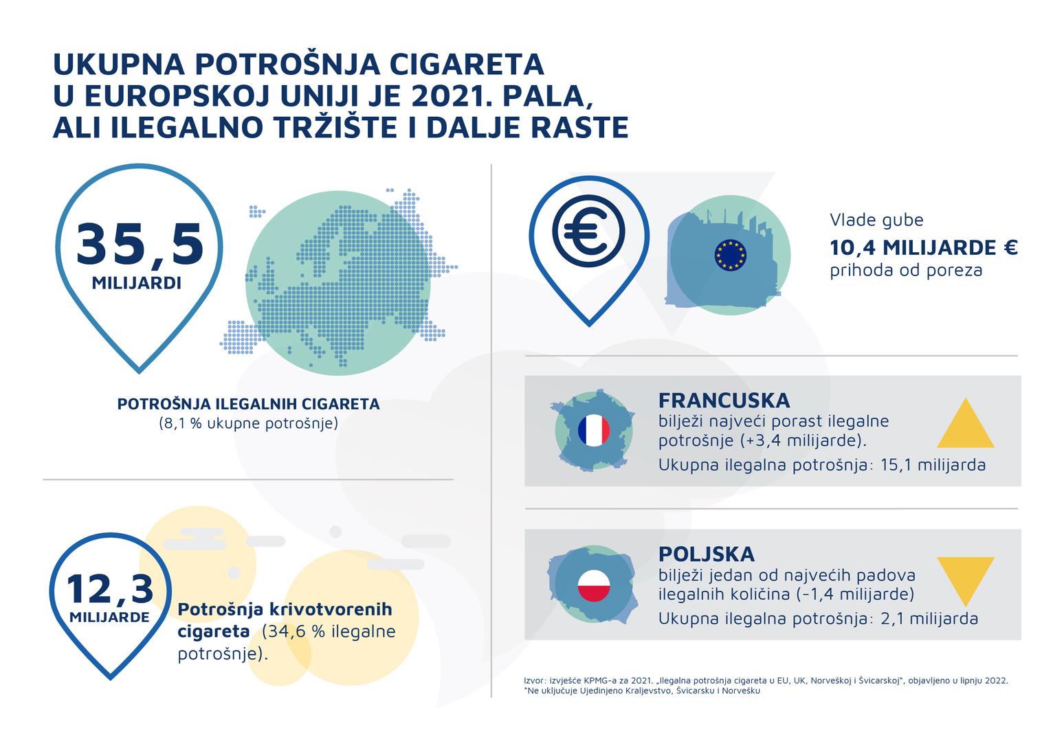 Procjenjuje se da je 2021. godine u Europskoj uniji konzumirano 1,3 milijarde ilegalnih cigareta više, što čini 8,1 posto ukupne potrošnje