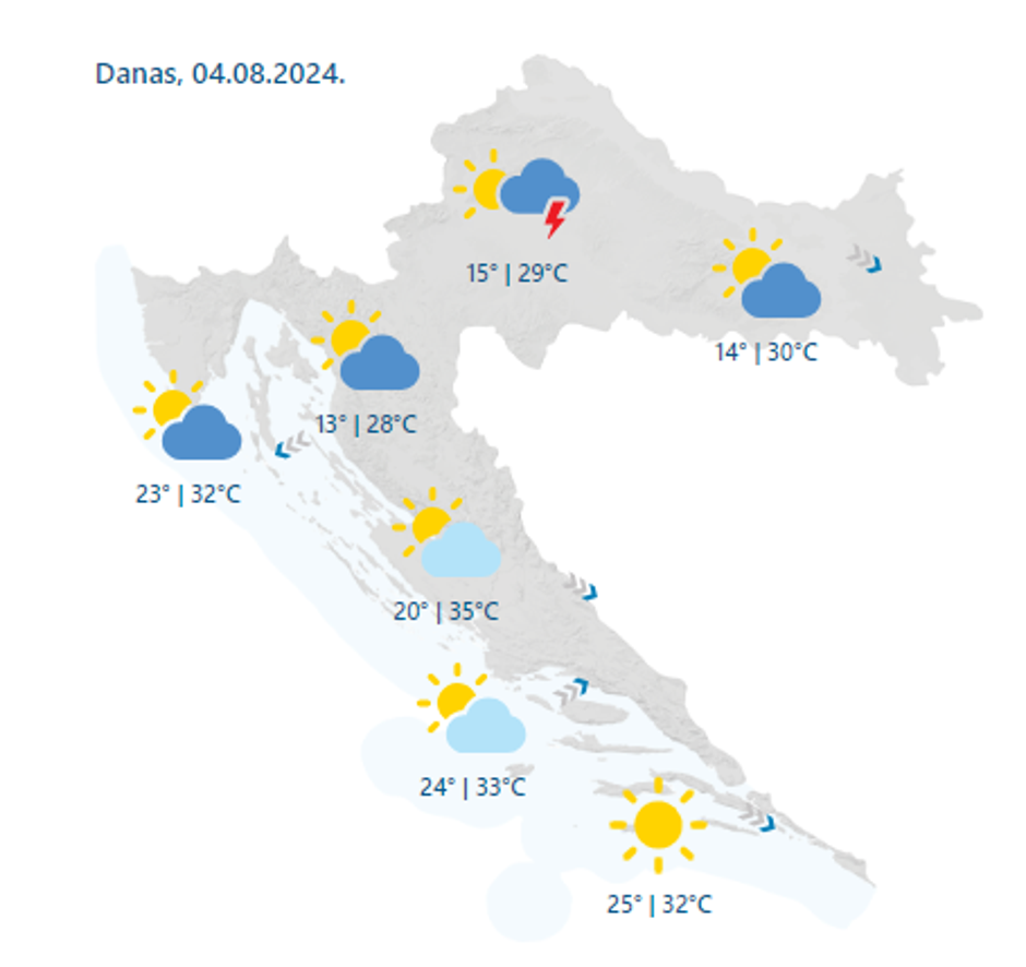 Na sjevernom Jadranu u noći i ujutro će puhati burin, a zatim danju umjeren zapadnjak i jugozapadnjak. Kao i u Gorskoj Hrvatskoj, bit će djelomično sunčano, pa i sunčanije, uz više oblaka u Istri i Gorskom kotaru, gdje lokalno može pasti pokoji popodnevni pljusak. Najniža temperatura zraka će biti od 13 °C u gorju do 24 °C na otocima, a najviša između 28 i 33 °C. Dalmacija će imati još jedan vruć dan s obiljem sunčanih sati. Nakon burina, sredinom dana će zapuhati maestral pa će more, s temperaturom oko 26 °C, biti malo do umjereno valovito.