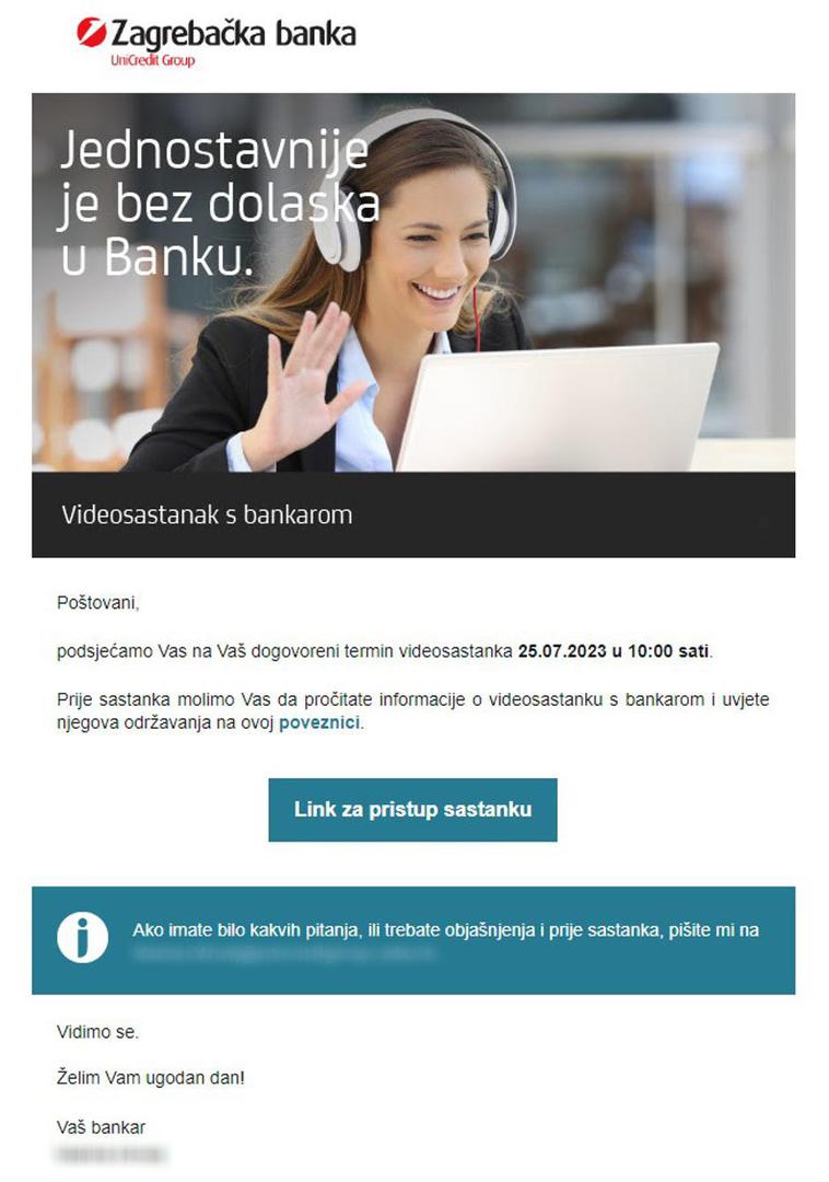 Jedan od noviteta, koji mi se ponudio i koji me ujedno oduševio, jest zakazivanje videosastanka s bankarom. Savršeno rješenje za ugovaranje manjega gotovinskog kredita prije odlaska na ljetovanje jer sam odlučila nakon godišnjeg napraviti nužne popravke u stanu. U svojoj sam m-zaba aplikaciji odabrala željeni termin za online sastanak, a ubrzo sam putem e-maila dobila i termin.