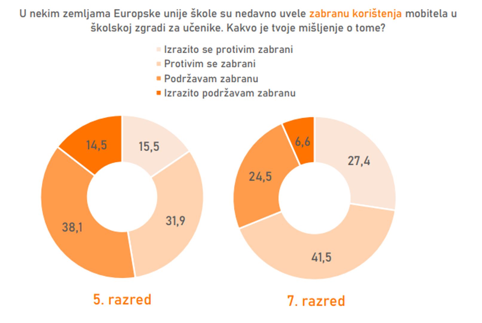 - Dok učiteljska perspektiva ukazuje na jasno pozicioniranje prema mogućim zabranama, učenički odgovori ukazuju na raznolikost stavova. U skladu sa spoznajama o razvoju adolescenata, stariji učenici/ce su kritičniji prema mogućnosti ograničavanja mobitela u školama. Ipak znakovit je udio onih koji zagovaraju zabranu, naime nešto manje od trećine učenika/ca sedmih razreda podržava ili izrazito podržava zabranu korištenja mobitela u školama. Sklonost zabrani iskazana od strane velike većine učitelja/ica, ali i značajnog dijela učenika/ca, ukazuje da je korištenje mobitela u hrvatskom osnovnoškolskom odgoju i obrazovanju neprikladno te da se ne koriste brojne mogućnosti digitalne tehnologije u školama. - poručuju autori provedena istraživanja.