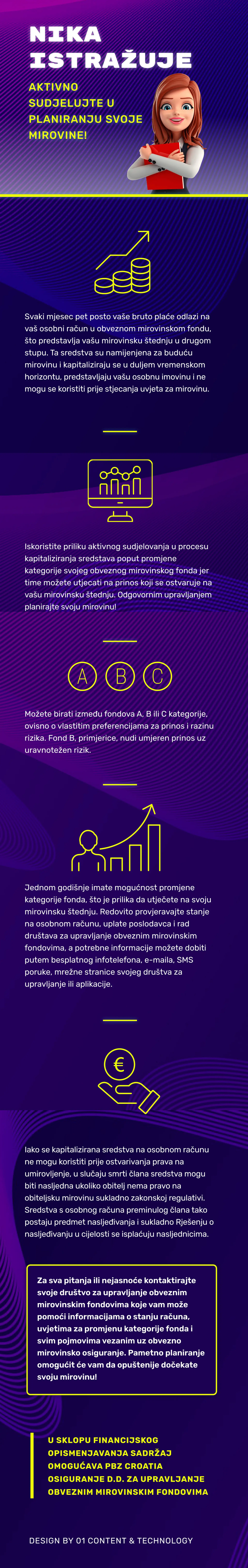 Nika je glavna junakinja serijala o financijskom opismenjavanju PBZ CROATIA OSIGURANJE d.d. koja od 2020. godine na jednostavan i pristupačan način približava široj javnosti ključne informacije o mirovinskom sustavu i štednji, mirovinskim fondovima te potrebi individualne brige za svoju mirovinu. U ovogodišnjem serijalu Nika istražuje kako razni društveni fenomeni utječu na mirovinski sustav, dodatno potičući razumijevanje i svijest o ovoj važnoj temi.