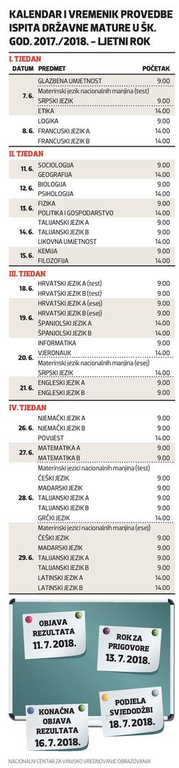 Ispiti počinju 7. lipnja, a objavu rezultata maturanti očekuju 11. srpnja (imaju dva dana za eventualne prigovore). Podjela svjedodžbi u svim srednjim školama bit će 18. srpnja.