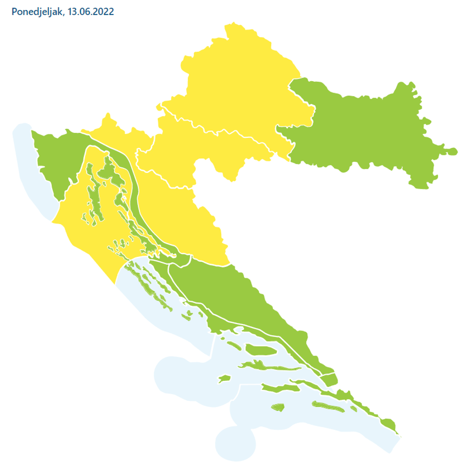 Zbog izraženijih pljuskova s grmljavinom uz prolazno jak vjetar te mogućnost pojave tuče, DHMZ je izdao žuto upozorenje za Zagrebačku, Karlovačku i Gospićku regiju. Naime, u sve tri regije vjerojatnost grmljavine je između 50 i 70 posto.