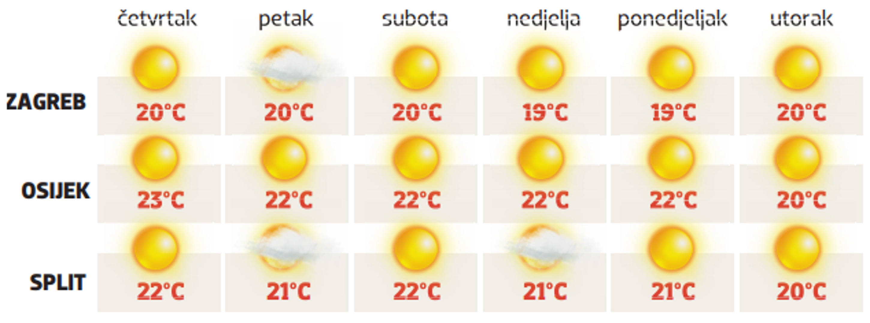 Jedino što će nas sljedećih nekoliko dana podsjećati na jesen su maglovita i oblačna jutra u unutrašnjosti, što se ponegdje može zadržati i dulje tijekom prijepodneva. No, sunca te suhog i toplog vremena u većem dijelu dana neće nedostajati ni na moru ni na kopnu. Vjetar će većinom biti slab, u istočnoj Hrvatskoj do umjeren jugoistočni i istočni, a na Jadranu povremeno umjeren sjeverozapadnjak, na sjevernom dijelu i bura.