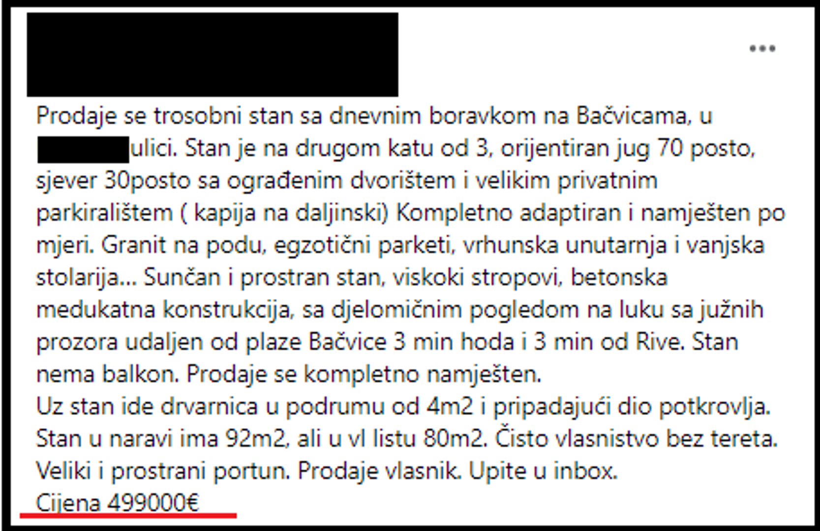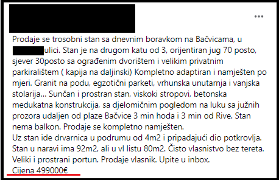 Sunčan i prostran stan, visoki stropovi, betonska međukatna konstrukcija, s djelomičnim pogledom na luku s južnih prozora. Od plaže Bačvice je udaljen tri minute hoda... Stan nema balkon. Prodaje se kompletno namješten. Uz stan ide drvarnica u podrumu od 4 m² i pripadajući dio potkrovlja. Stan u naravi ima 92 m², ali u vl. listu 80 m². Čisto vlasništvo bez tereta. Veliki i prostran portun. Prodaje vlasnik. Cijena 499.000 €", napisano je u grupi 'Njuškaj Split'.