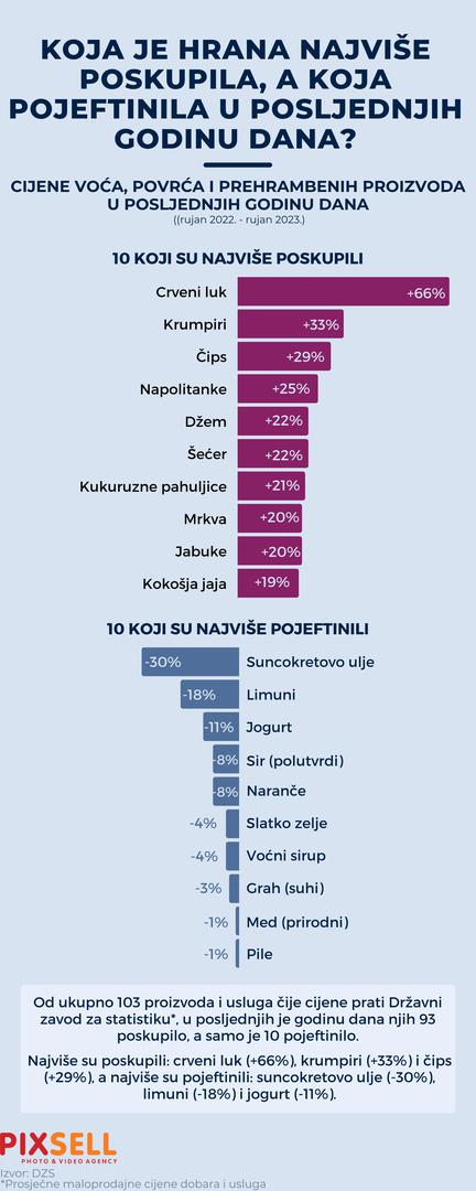 Od ukupno 103 proizvoda i usluga čije cijene prati Državni zavod za statistiku u posljednjih godinu dana njih 93 je poskupjelo, a samo je 10 pojeftinilo. U odnosu na rujan 2022. godine najviše je pojeftinilo suncokretovo ulje koje je u rujnu ove godine bilo jeftinije za 30 posto. Limun je jeftiniji za 18 posto, jogurt za 11, polutvrdi sir za 8, slatko zelje za 4, grah za 3, i med i piletina za jedan posto.