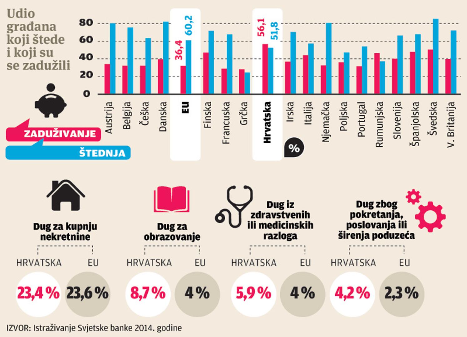 Ipak, prema istraživanju Svjetske banke, dodaje, štednja naših građana je blizu prosjeka EU i znatno viša nego u Grčkoj, Rumunjskoj i Bugarskoj, dok smo u zaduživanju prvi u EU. Dok se 23,4% građana zadužuje zbog kupnje nekretnine, što odgovara prosjeku EU, zaduživanje za potrebe obrazovanja, iz zdravstvenih razloga i zbog pokretanja posla u nas je iznad prosjeka EU.