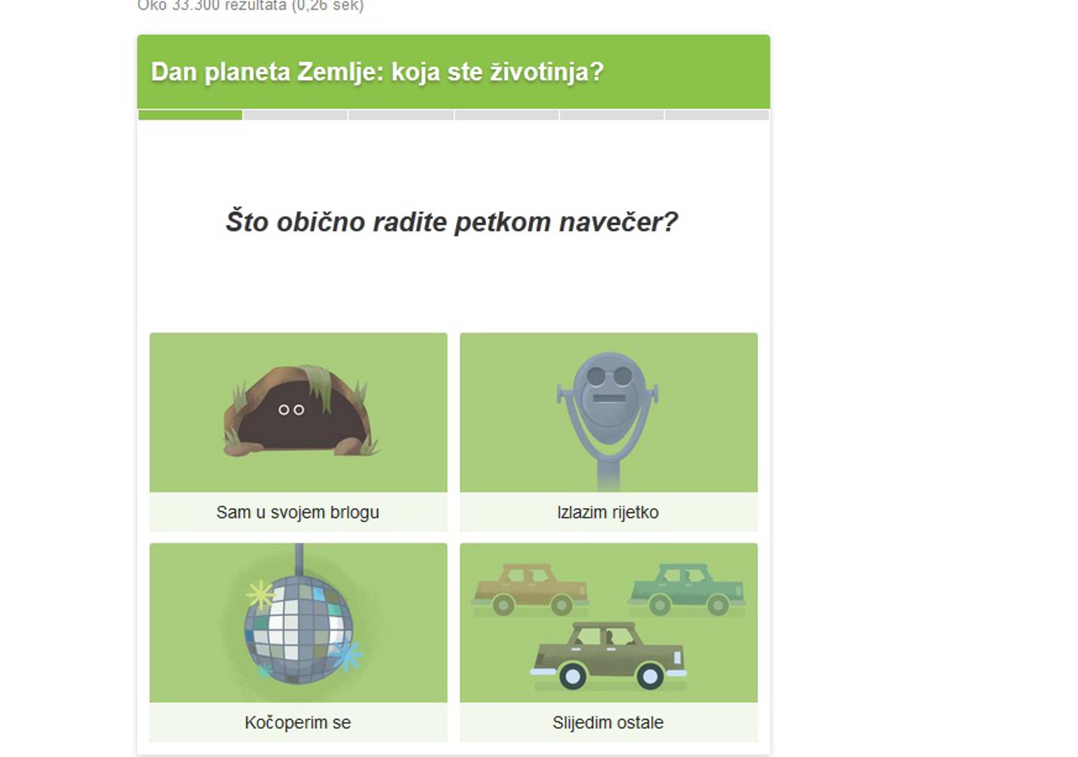 Danas je to naša planeta, a klikom na nju otvorit će se zanimljiv kviz s pet pitanja sa zanimljivim ilustracijama koji će vam otkriti koja ste životinja i kakav vam je karakter.
