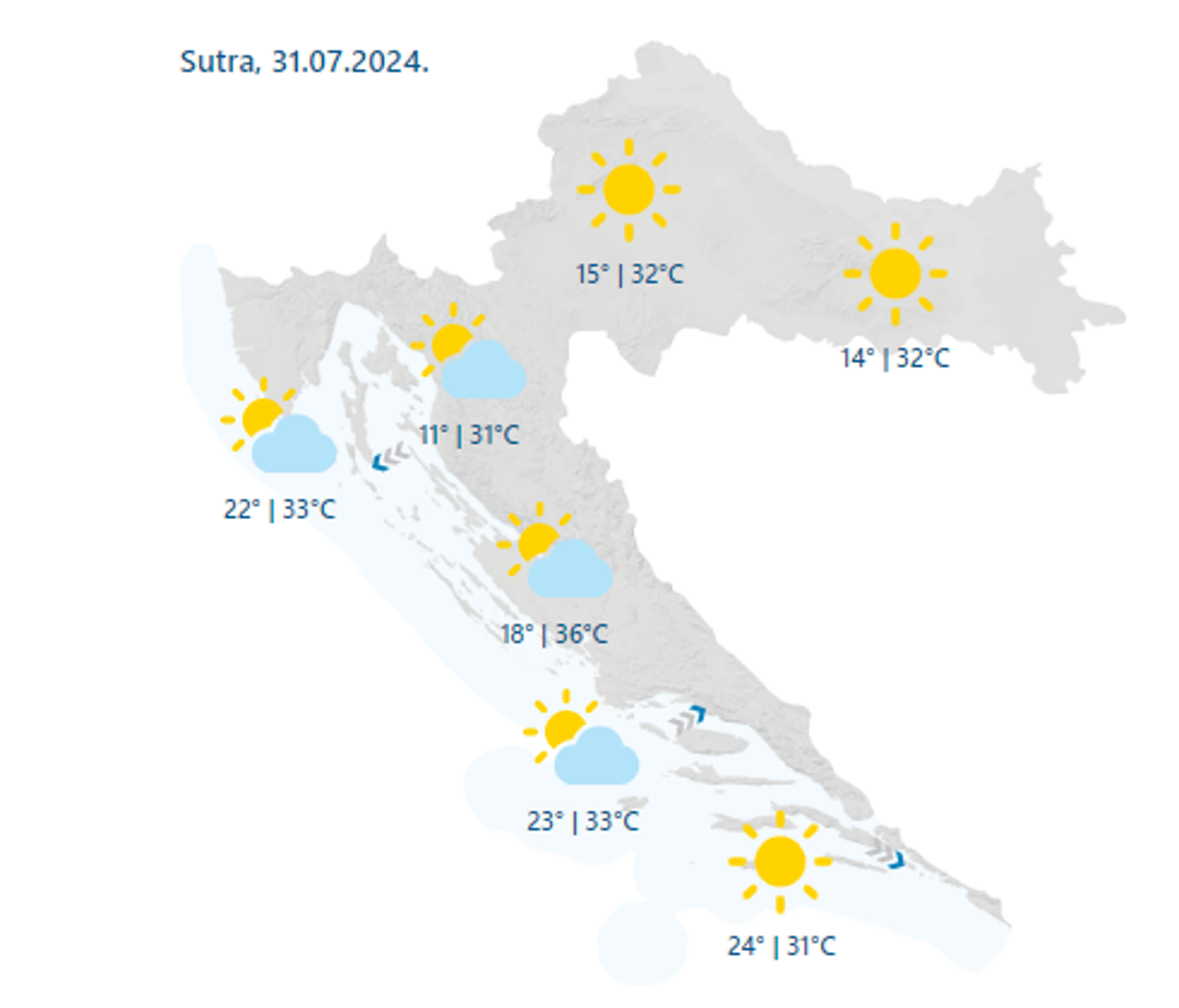 Pred nama je još jedan sunčan i vruć dan, u unutrašnjosti su jutra svježa i ugodna, što omogućava lakše podnošenje dnevne vrućine. Na Jadranu more i bura doprinose ugodnijim uvjetima. Ovakvo vrijeme zadržat će se do sredine vog tjedna. Četvrtak donosi porast temperature, ali i više oblaka, što će mnogima donijeti sparinu. Na zapadu unutrašnjosti očekuju se pljuskovi s grmljavinom, a kiša i grmljavina gotovo su sigurne u petak i subotu. Postoji i velika vjerojatnost za lokalna olujna nevremena.