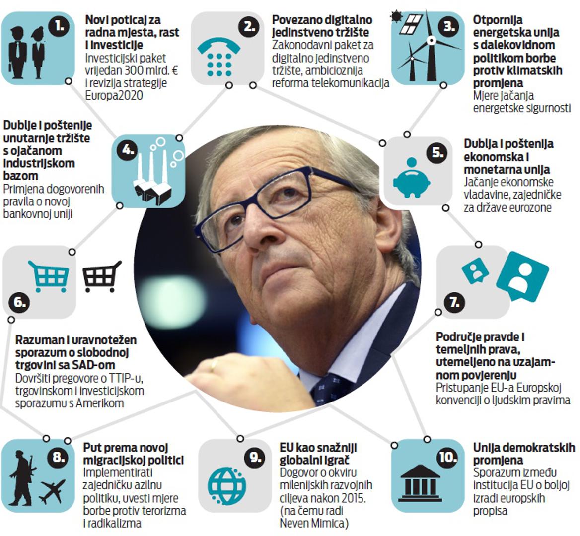 U pismu koje je u srijedu poslao Europskom parlamentu i Vijeću Europske unije, novi predsjednik Europske komisije Jean-Claude Juncker nabrojio je deset prioriteta kojima će pokušati potaknuti investicije i gospodarski rast te politički i gospodarski ojačati Europsku uniju, a u Hrvatskoj i drugdje najviše se iščekuju detalji o prvoj točki sa te liste – 300 milijardi eura vrijednom paketu mjera za stvaranje radnih mjesta, gospodarskog rasta i poticanje investicija.