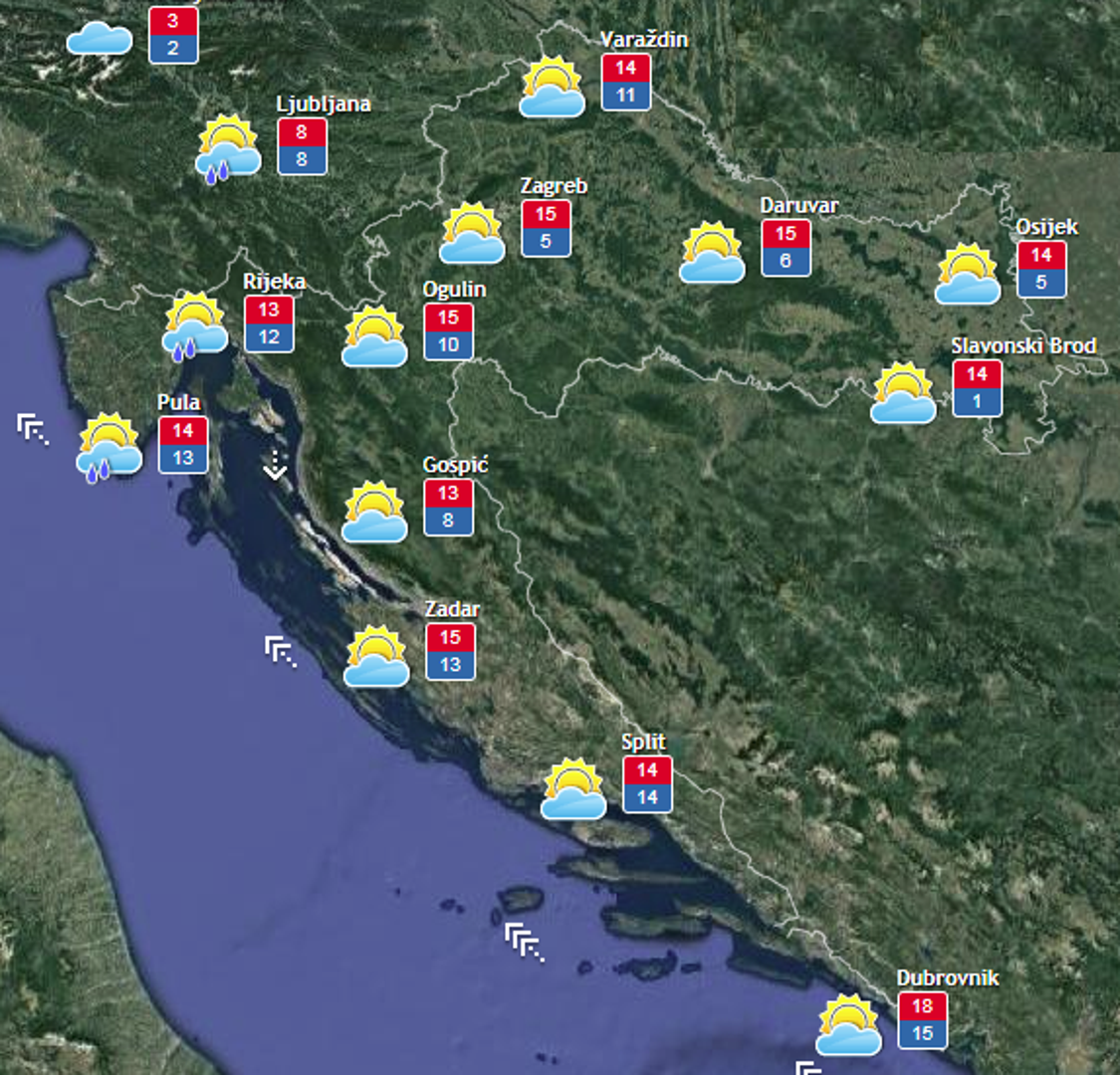 Vjetar na kopnu većinom slab, u gorskoj Hrvatskoj povremeno jak južni i jugozapadni. Na Jadranu će puhati umjereno i jako jugo, prema otvorenom moru srednjeg Jadrana povremeno i olujno. Najviša dnevna temperatura zraka uglavnom od 12 do 17 °C, izvijestio je Državni hidrometeorološki zavod (DHMZ).