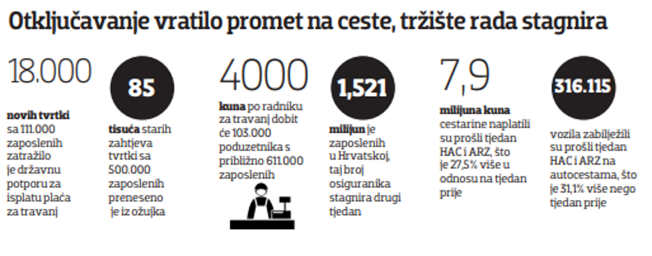 Ni ova lista nije konačna jer se zahtjevi mogu predati i za svibanj, za plaću koja se isplaćuje u lipnju, a što će biti dalje, još se ne zna. Vlada je zasad otvorila mogućnost produljenja moratorija (odnosno otpisa) na porezne obaveze, dok se o masovnoj isplati plaća na teret države nitko ne istrčava. Hrvatska ne prednjači u europskim razmjerima samo po malom broju zaraženih novim virusom nego i po blagom smanjenju broja zaposlenih od svega 1,5 posto!