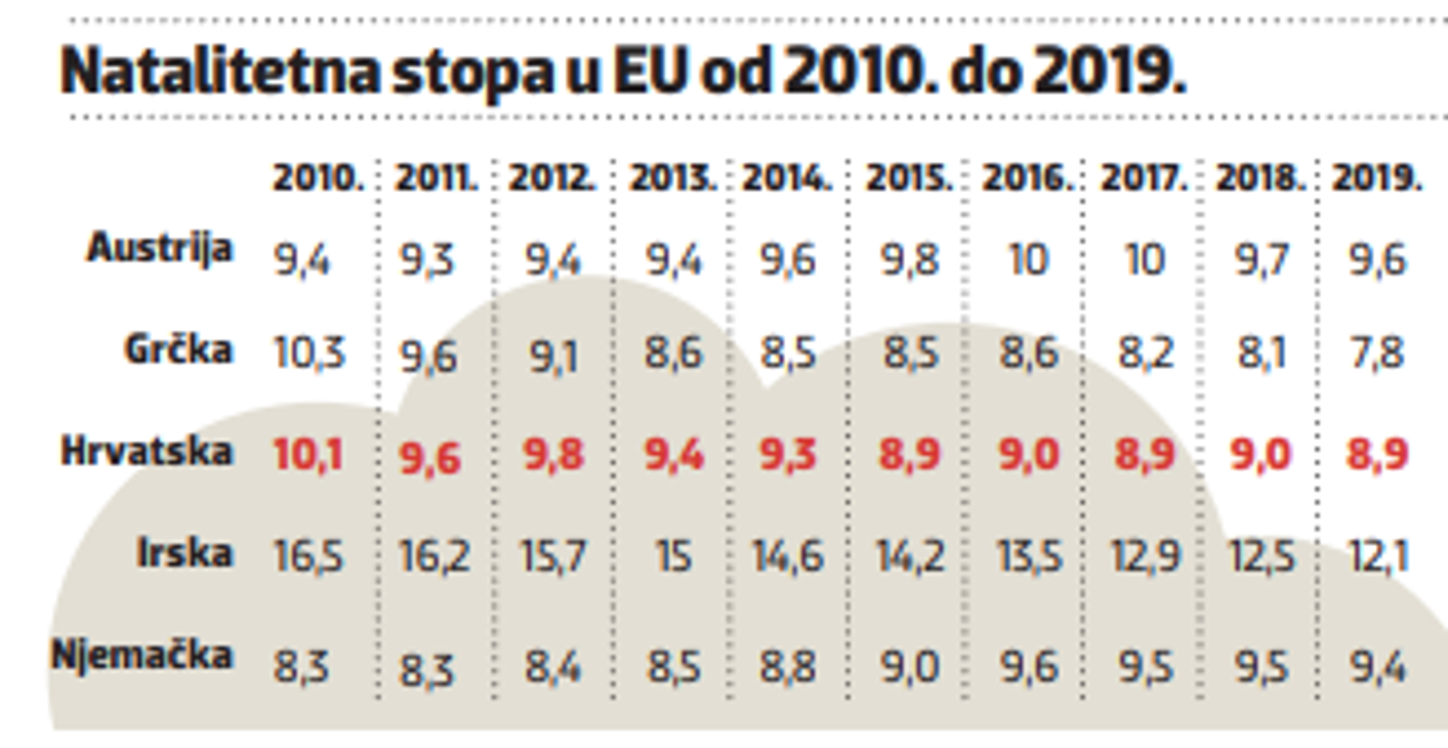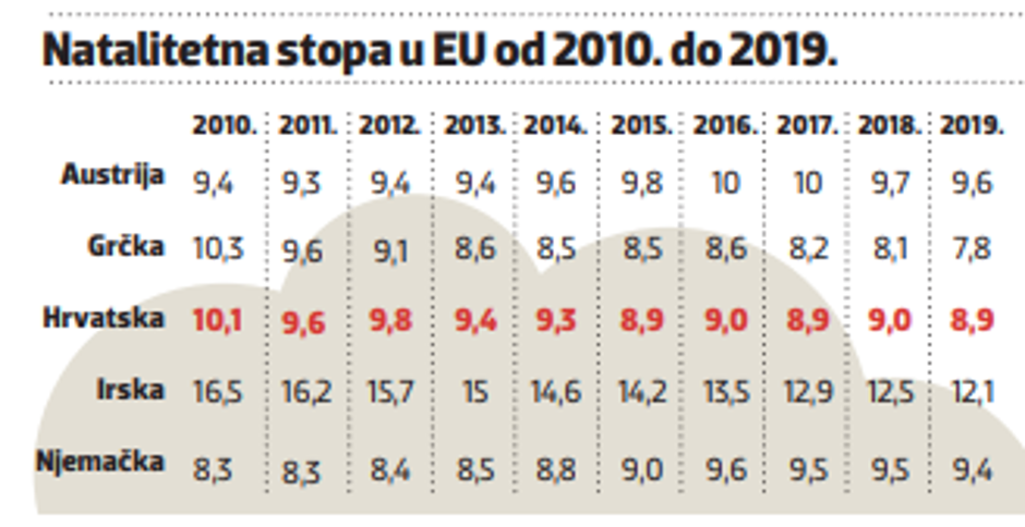 Demografski pokazatelji govore da cijela Europa stari, no prof. Akrap naglašava da to nije usporedivo s Hrvatskom. Neke europske zemlje vlastitim su populacijskim politikama uz blage migracije vidno popravile svoje natalitetne krivulje, poput Mađarske, navodi naš demograf. Ta je susjedna zemlja 2010. godine, prema Eurostatovim podacima, imala stopu nataliteta na tisuću stanovnika 9/1000, a danas je na europskom prosjeku od 9,5/1000. Hrvatska je ispod europskog prosjeka prema natalitetnoj stopi, koja kod nas iznosi 8,9/1000. Sporadične i parcijalne intervencije kao što su povećanje neke naknade nakon što je ona godinama bila u tragično malom iznosu nisu populacijska politika.