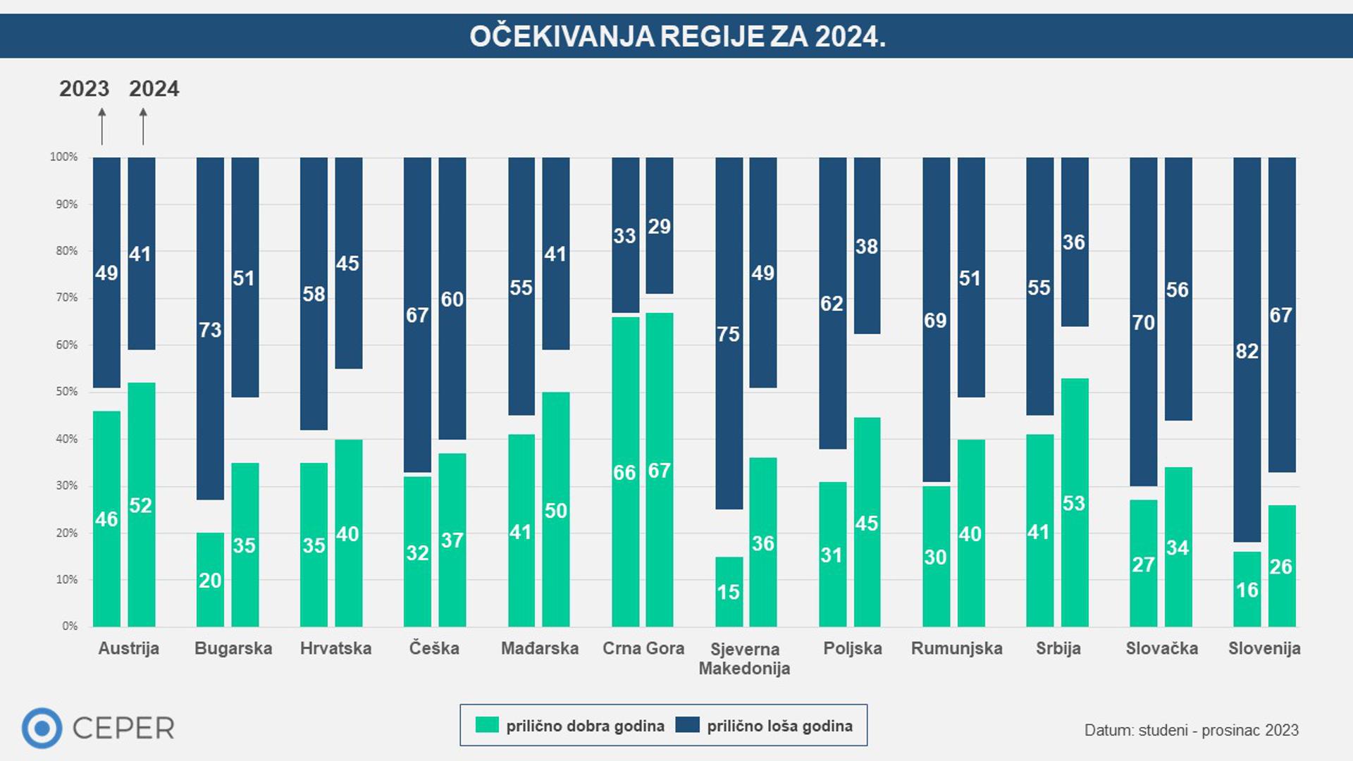 Najoptimističnija je Crna Gora i po pitanju očekivanja za 2024.; 67 posto tamošnjih ispitanika misli da će ova godina biti "prilično dobra". Složili se ne bi Hrvati, kojih prosperitet očekuje samo 40 posto. Ista je situacija i u Rumunjskoj, dok je Bugara, Čeha, Makedonaca i Slovaka optimističnih 30-39 posto, a najpesimističniji i u ovoj kategoriji jesu Slovenci. Samo 26 posto anketiranih susjeda nada se dobroj 2024.