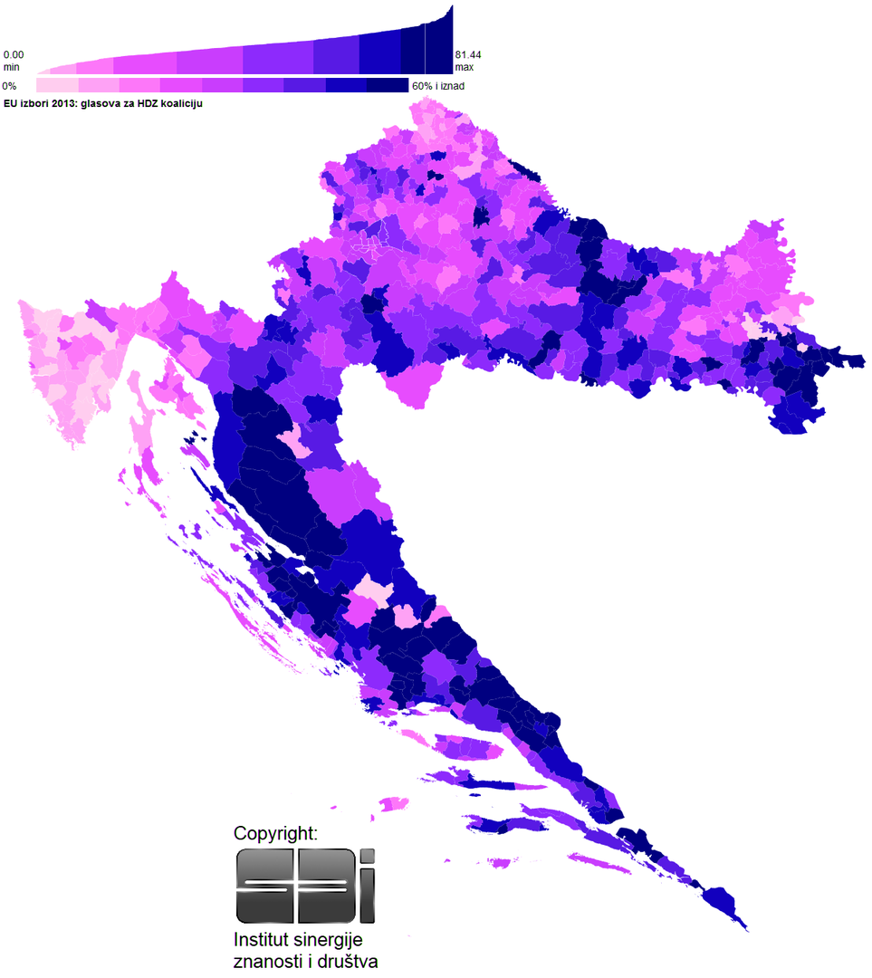 Slika pokazuje postotak glasova koje je koalicija HDZ-a (HDZ,HSP-AS,BUZ) dobila po općinama i gradovima, kao i po gradskim četvrtima Grada Zagreba.