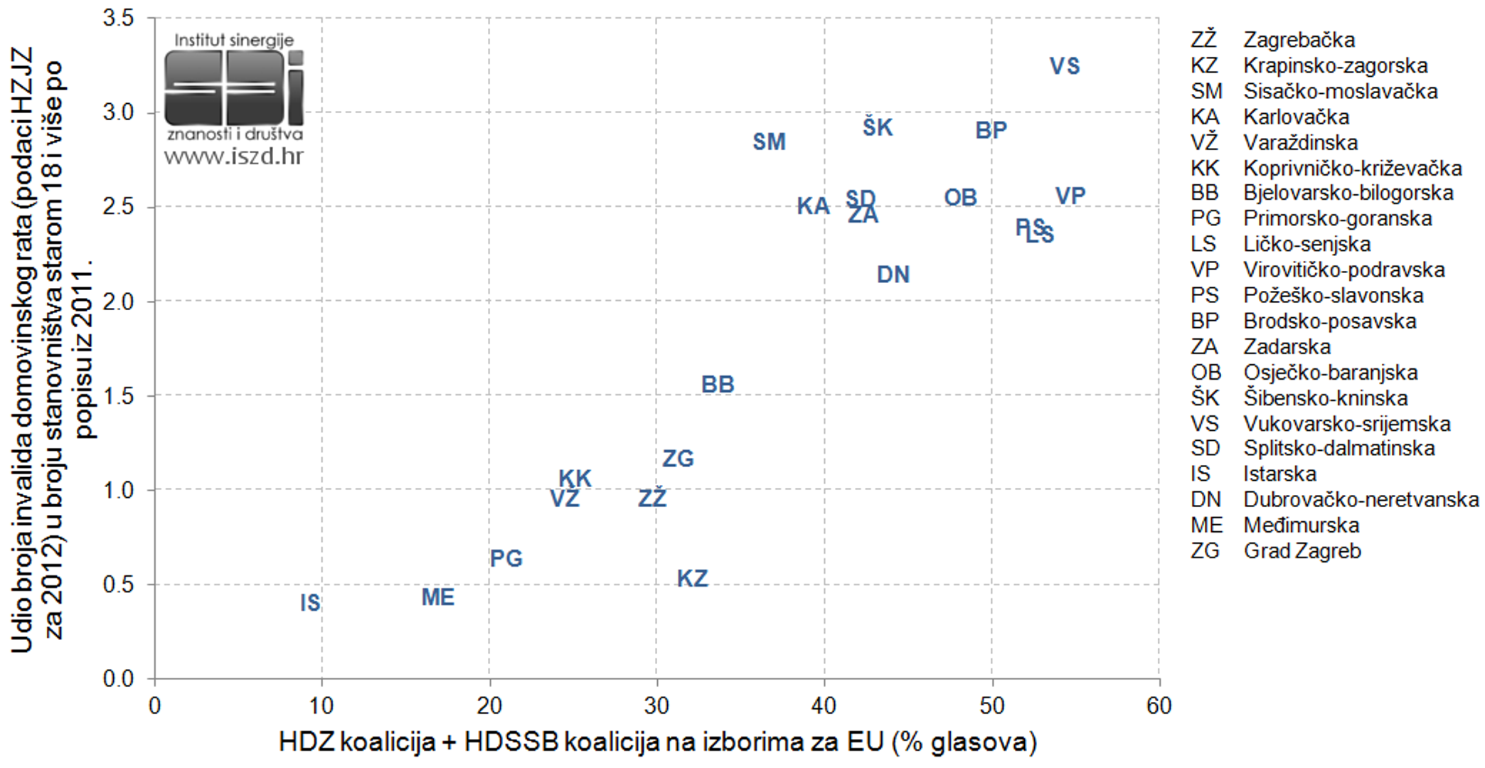 U svemu tome veliku ulogu još uvijek igraju i posljedice ratnih stradanja. Stoga smo od Hrvatskog zavoda za javno zdravstvo uzeli podatke o broju ratnih vojnih invalida u 2012. i usporedili ih s udjelom glasova na EU izborima 2013. za HDZ i HDSSB koalicije.