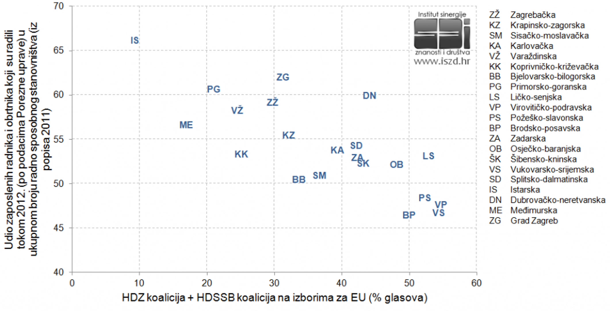 Uočava se snažna korelacija – što su ekonomski pokazatelji lošiji, to je veći broj glasova za HDZ i HDSSB koalicije.