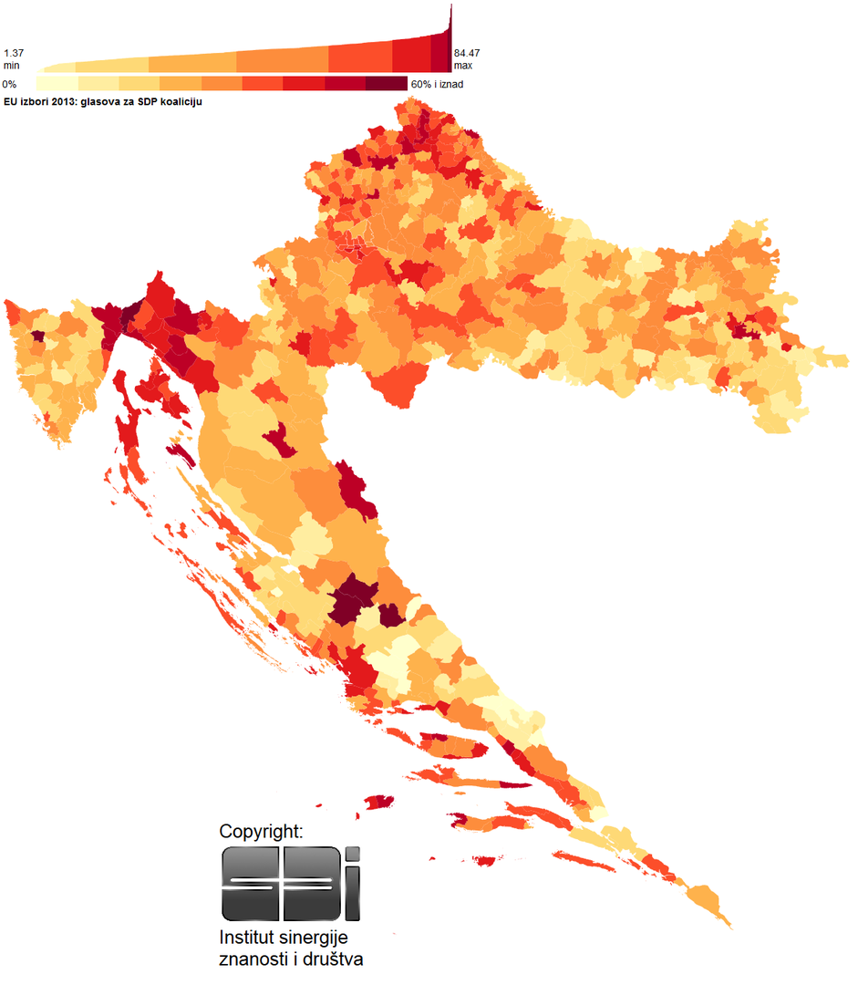 Na ovoj mapi prikazan je udio glasova za koaliciju okupljenu oko SDP-a (SDP,HNS,HSU).