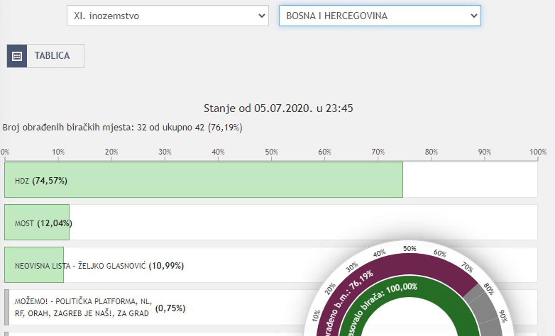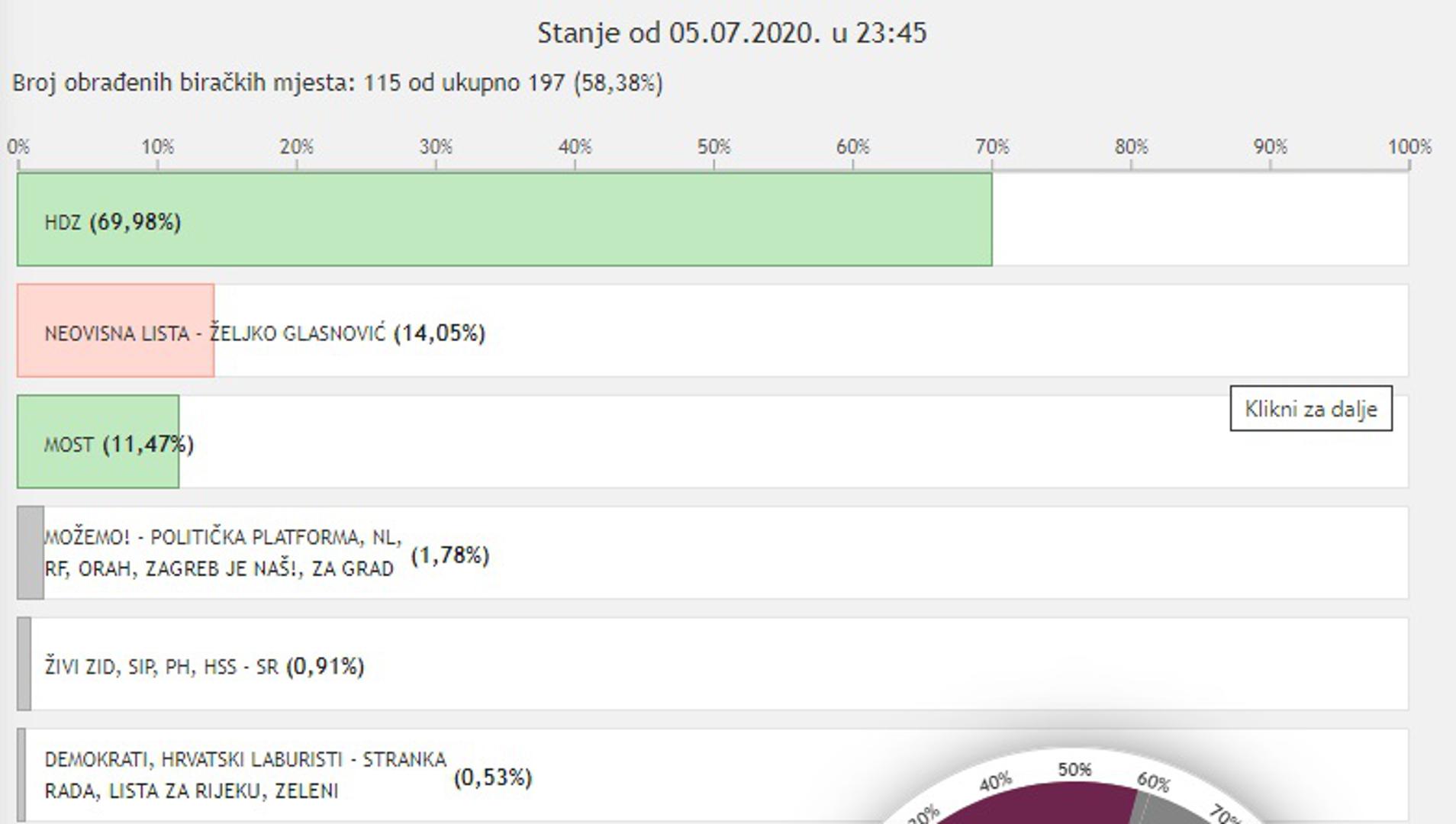 Do 23.45 sati obrađeno je ukupno 53,38 % glasova, odnosno 115 biračkih mjesta od ukupno 197. Prema dosadašnjim rezultatima uvjerljivo vodi HDZ s 69,98 % glasova, dok je na drugom mjestu Neovisna lista - Željko Glasnović s 14,05% glasova. Treći je Most s 11, 47%, dok je platforma Možemo osvojila svega 1,78% glasova dijaspore.