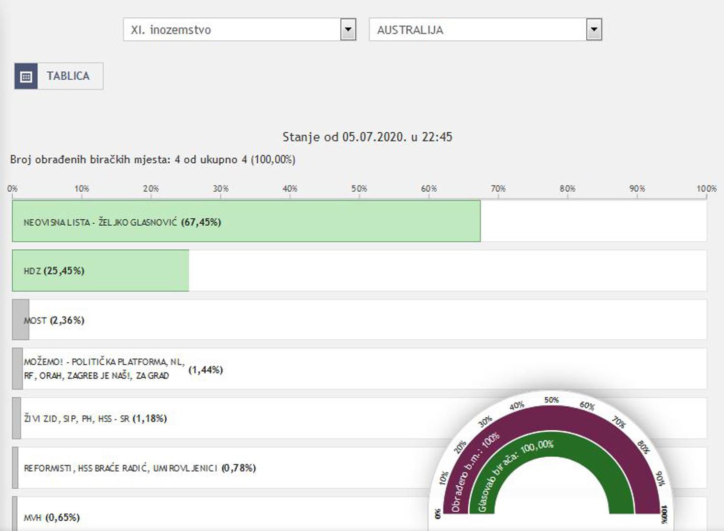 U Australiji koja je prva izašla na birališta i u kojoj su obrađena sva biračka mjesta na prvom je mjestu Neovisna lista Željko Glasnović s 67,45% glasova, 25, 45% dobio je HDZ, a samo 2,36 posto Most.