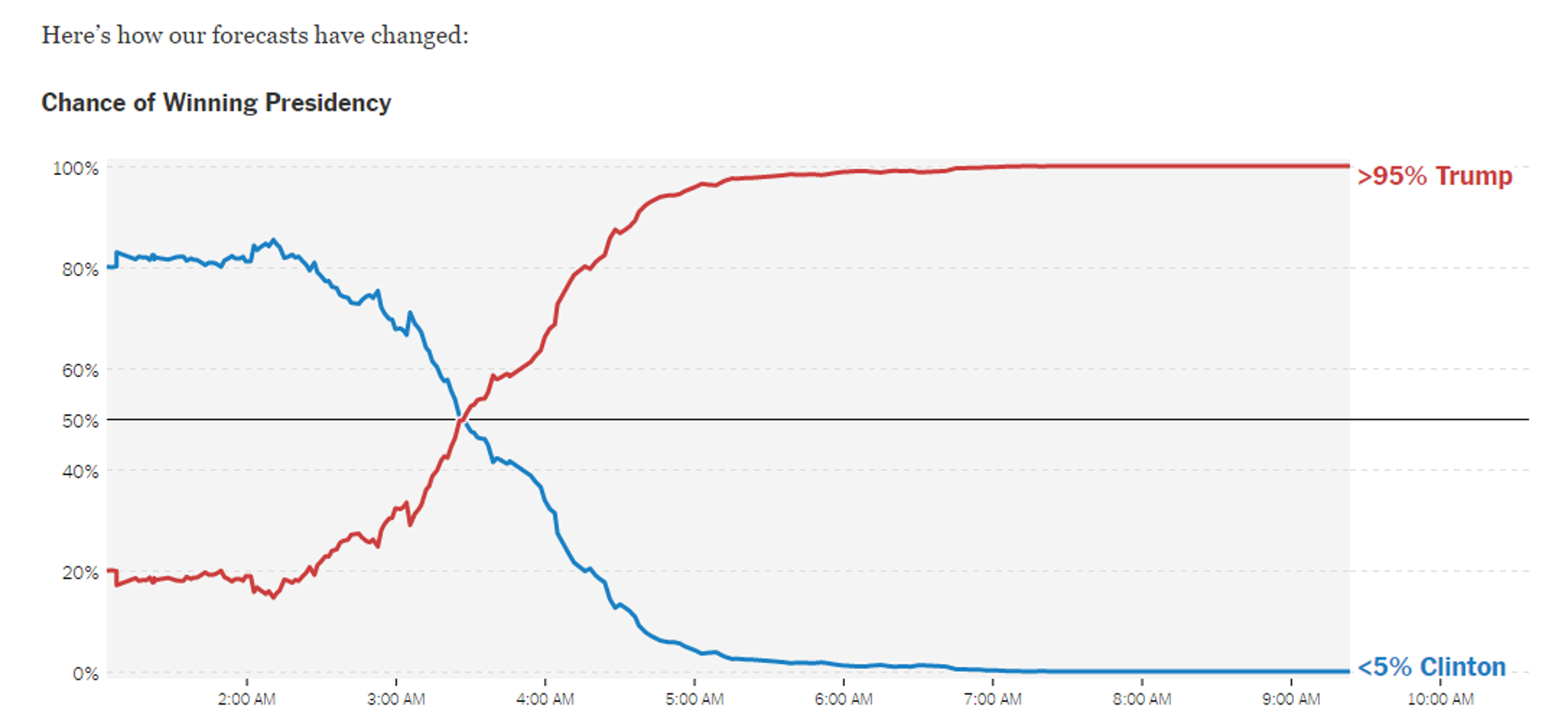 Prema grafu koji je objavio New York Times, vidi se da su se na samom početku, kada su počeli pristizati prvi rezultati, velike šanse davale Hillary Clinton. No, sve se počelo mijenjati nešto poslije 3 sata kada je Donald Trump osvojio Floridu, Sjevernu Karolinu i Ohio.