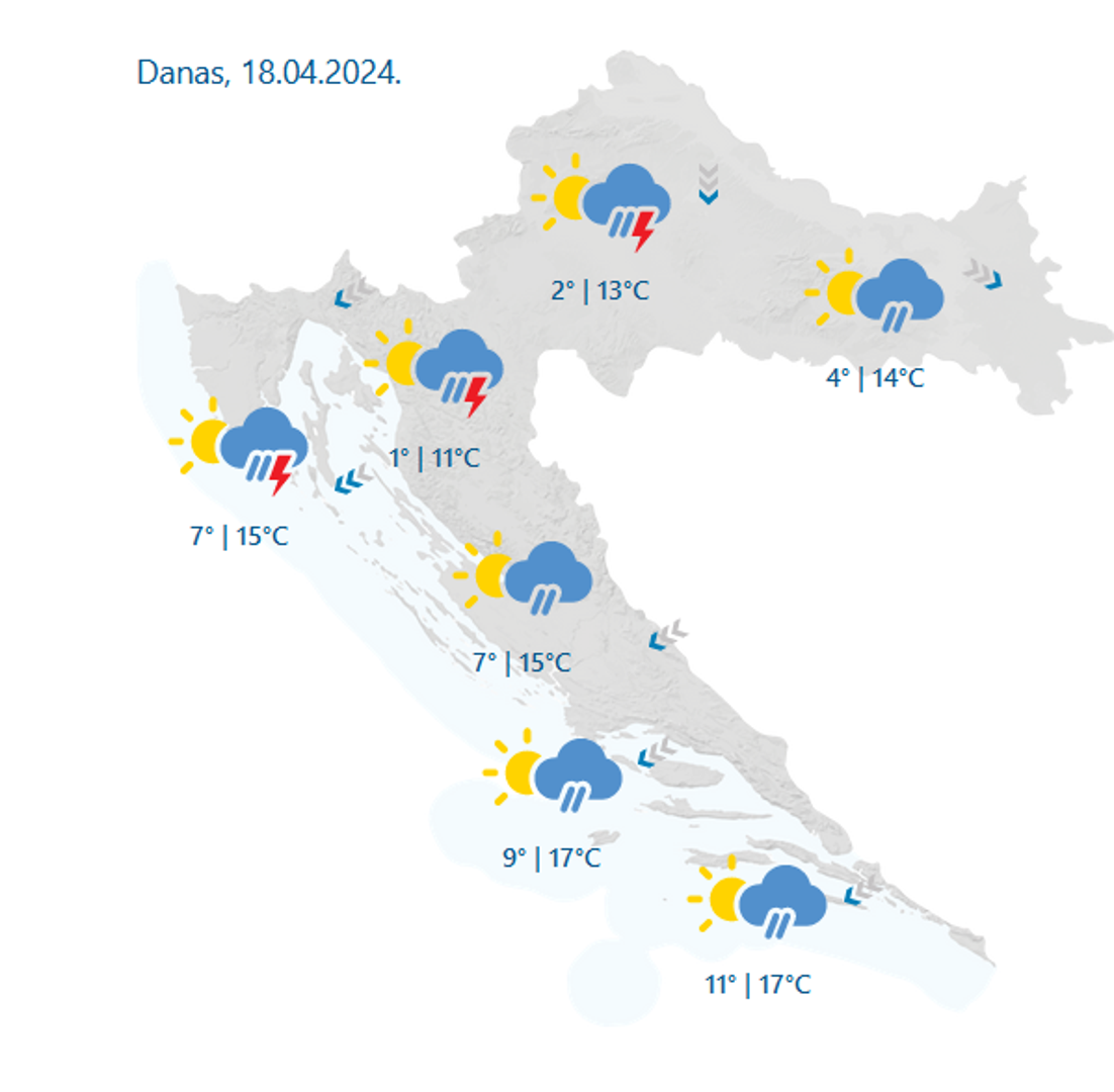 "U četvrtak u Slavoniji, Baranji i Srijemu djelomice sunčano, ali nestabilno. Uz promjenjivu naoblaku sredinom dana mjestimice je moguća kratkotrajna kiša, osobito u najistočnijim predjelima. Povremeno će puhati umjeren sjeverozapadnjak, a popodnevna temperatura između 12 i 14 °C.U središnjoj Hrvatskoj u prvom dijelu dana sunčanije, a popodne umjerena, lokalno i povećana naoblaka te poneki pljusak, osobito uz granicu sa Slovenijom. Jutro hladno, temperatura između 1 i 3 °C, a popodnevna oko 13 °C", ustvrdila je meteorologinja dr. sc. Petra Mikuš Jurković iz DHMZ-a.