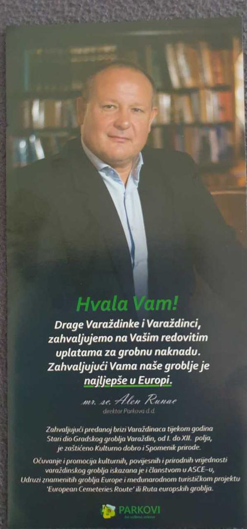 "Drage Varaždinke i Varaždinci, zahvaljujemo vam na vašim redovitim uplatama za grobnu naknadu. Zahvaljujući vama naše groblje je najljepše u Europi”, piše u letku na kojem je slika A. Runca i logo Parkova, tvrtke koje upravlja varaždinskim grobljem. Podsjeća i da je varaždinsko groblje učlanjeno u ASCE, udrugu znamenitih groblja Europe.