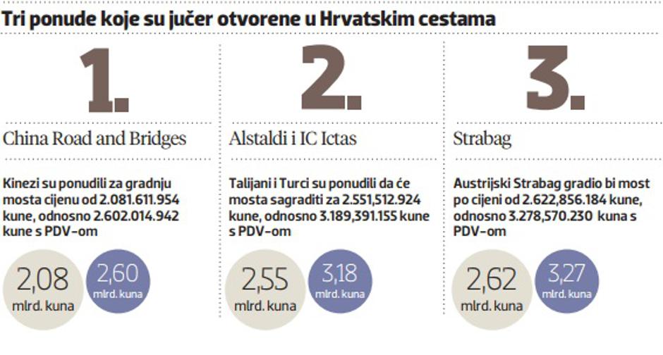 Astaldi je pak trebao graditi u Hrvatskoj autocestu Zagreb – Goričan po koncesijskom modelu, no taj ugovor je hrvatska Vlada raskinula 2000. Astaldi je pak s IC Icatasem sagradio treći most preko Bospora, dug 2,1 kilometar. Strabag je već dugo godina prisutan u Hrvatskoj, dobio je brojne projekte u cestogradnji. Strabag je bio primjerice izvođač radova na mostu Franje Tuđmana u Dubrovniku i na 1,45 kilometara dugom mostu Sheikh Khalifa u Abu Dhabiju.