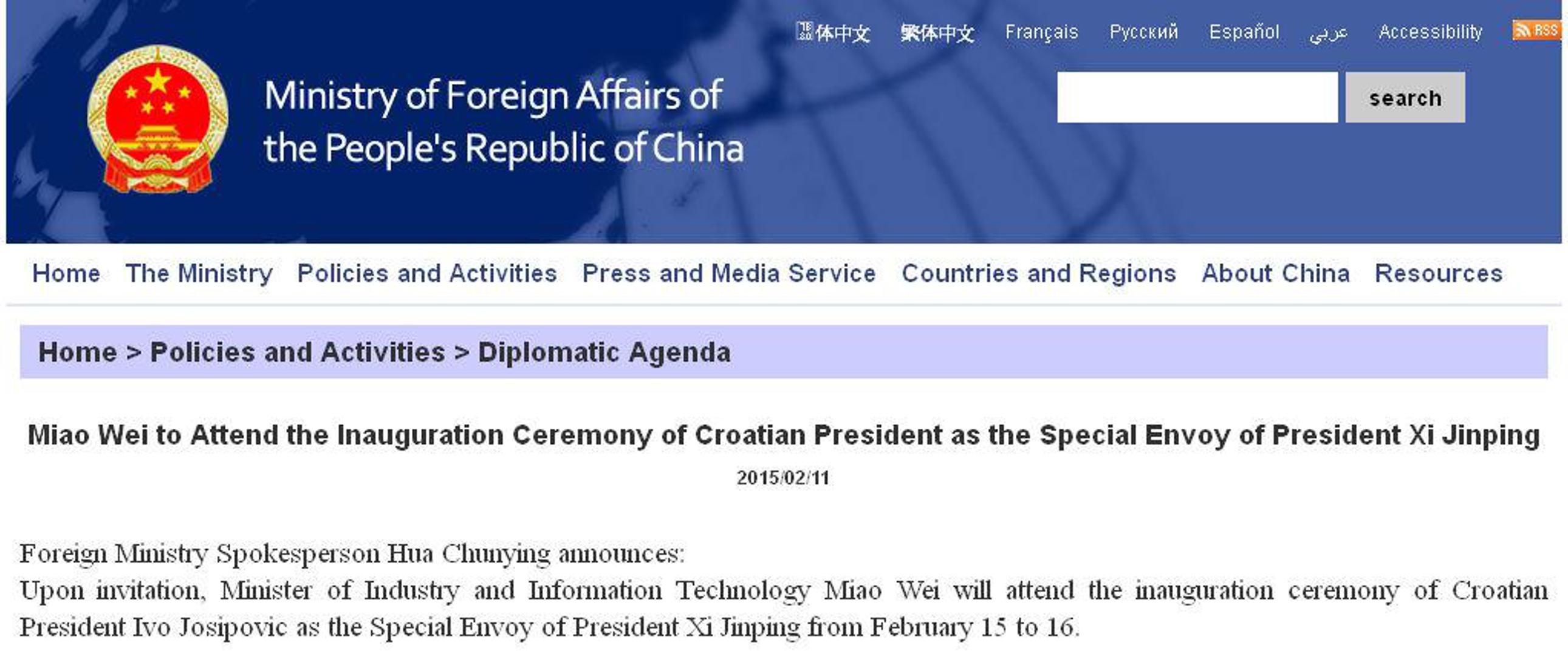 Na čiju inauguraciju u Zagreb dolazi posebni izaslanik kineskog predsjednika Xi Jinpinga, ministar industrije i informatičke tehnologije Miao Wei?