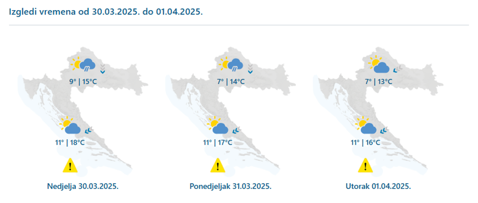 Sutra se u unutrašnjosti nastavlja promjenjivo vrijeme s mjestimičnom kišom – ujutro uglavnom na zapadu, a popodne na istoku. Sjeverac će jačati, povremeno s olujnim udarima podno Velebita, dok će bura na Jadranu biti umjerena do jaka. Jutarnje temperature ostat će između 7 i 12 °C, dok će dnevne doseći 13 do 18 °C, osim u gorju gdje će biti nešto niže. U ponedjeljak kiša ne posustaje, osobito u unutrašnjosti, a s prelaskom u utorak u višim predjelima moguć je i snijeg. Vjetar će ostati sjeverni, na Jadranu s burama i olujnim naletima, dok će temperature u unutrašnjosti lagano padati.