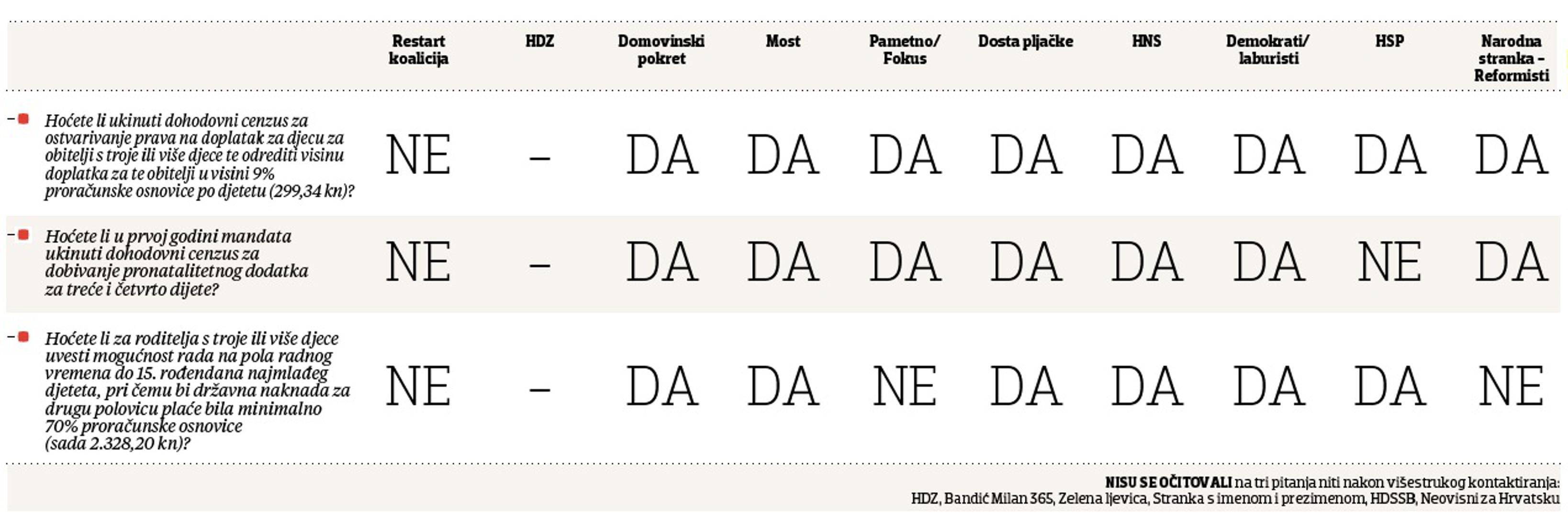 Stranke su anketirali o dječjem doplatku, mogućnosti rada na pola radnog vremena za jednog od roditelja troje i više djece do 15. rođendana najmlađeg djeteta pri čemu bi im država nadoknadila drugu polovicu plaće u iznosu od 2328 kn te o ukidanju dohodovnog cenzusa na pronatalitetni dodatak za treće i četvrto dijete. Dodatno su ih pitali i koje bi mjere demografske politike proveli budu li u izvršnoj vlasti. Inače, Europska direktiva o ravnoteži poslovnog i obiteljskog života obvezuje nas da se do 2022. svim roditeljima omogući, ako to žele, fleksibilno ili skraćeno radno vrijeme te rad od kuće gdje je moguć. HDZ Obitelji-3plus nije odgovorio na tri pitanja, no poslali su im odgovore o svojim demografskim mjerama. Udvostručili bi dječji doplatak, koji je sad socijalna pomoć obiteljima s niskim prihodima i iznosi do 300 kn. HDZ bi regulirao rad nedjeljom, subvencionirao 20.000 stambenih kredita za mlade obitelji, osigurao roditeljske naknade u visini pune plaće, povećao broj vrtića s dvosmjenskim radom...