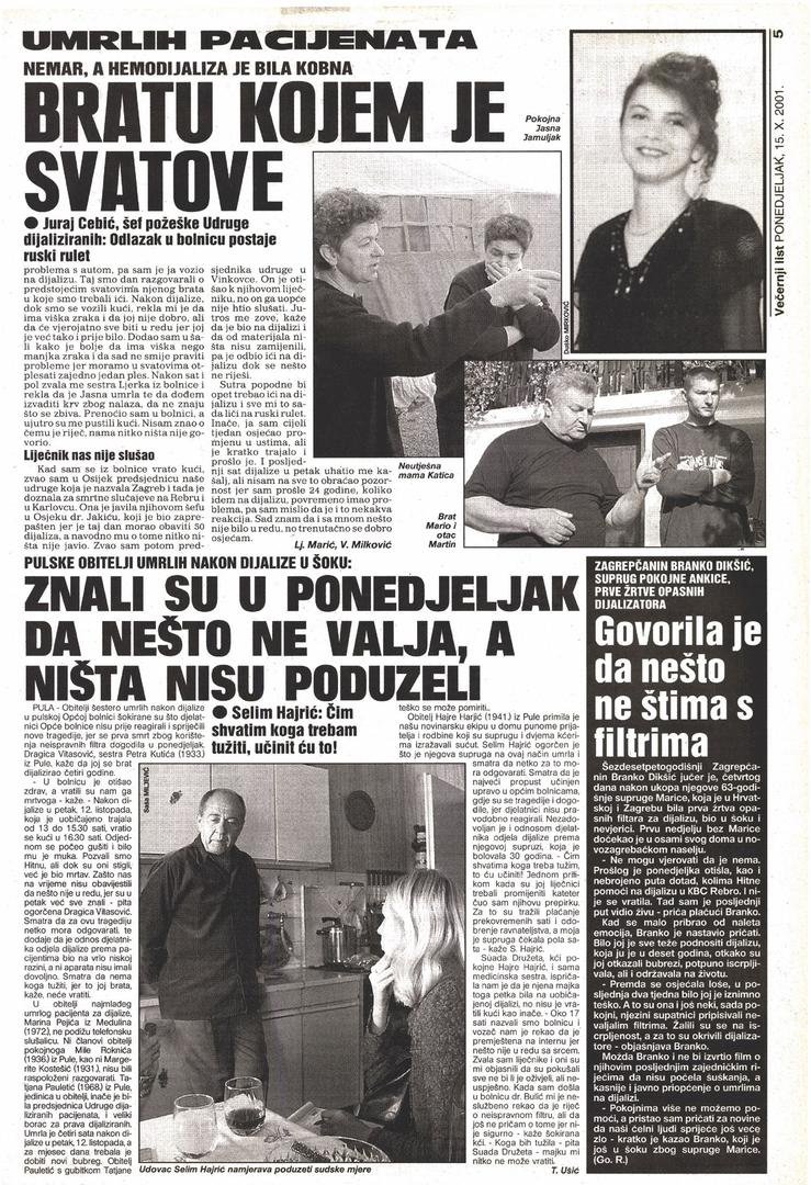 Među 23 pacijenata koji su tog listopada umrli zbog neispravnih dijalizatora bila je i Jasna Jamuljak, iz okolice Požege. Imala je samo 26 godina, a iza nje je već bilo desetljeće dijalize. Unatoč zdravstvenim problemima, radovala se svakom novom danu, voljela je život, a tog je petka bila posebno sretna i uzbuđena, jer u subotu je bilo vjenčanje njenog jedinog brata, Marija. U petak popodne Jasna je otišla u Opću županijsku bolnicu u Požegi, na još jednu hemodijalizu koja joj je, na žalost, bila i posljednja. Kada se nešto poslije 18 sati vratila kući, nije se osjećala dobro, brat ju je uzeo u naručje, stavio u auto, no na putu do bolnice Jasna je preminula, ne dočekavši bratovo vjenčanje, koje je s toliko nestrpljenja čekala. U istoj su bolnici u Požegi, istog kobnog dana, nakon hemodijalize, umrli su i Maša Golek iz Velike, Vasilija Mađarević iz Ratkovice i Aleksandar Kneis iz Požege.