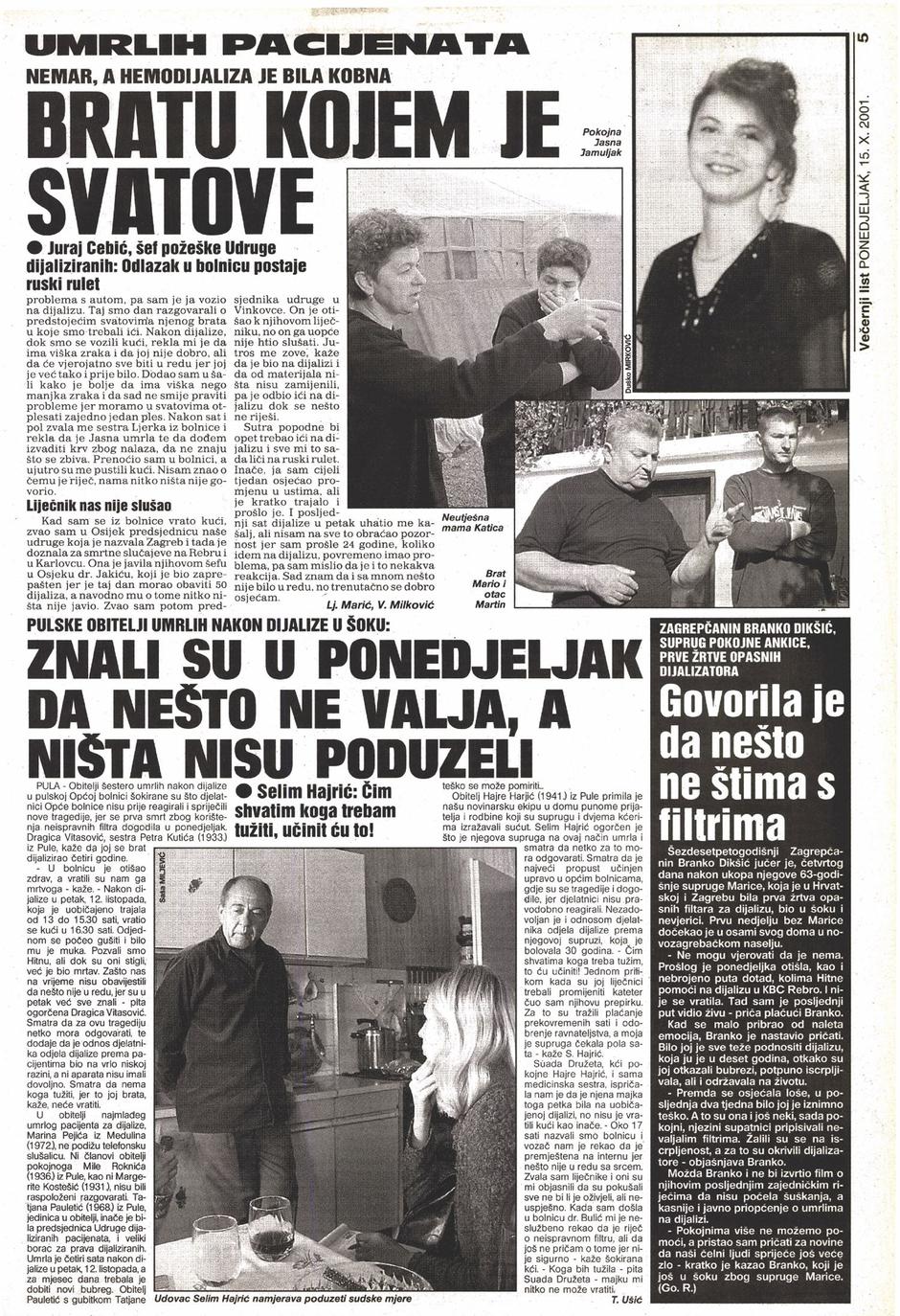 Tog kobnog listopada prvi bubrežni bolesnik na hemodijalizi umro je u ponedjeljak navečer, u utorak je umrlo još dvoje ljudi, u četvrtak troje. Drama u centrima za dijalizu u hrvatskim bolnicama kulminirala je u petak, a tragični se niz nastavio i u subotu kada je umrlo još četvero ljudi. Smrt je kosila pacijente u bolničkim centrima za hemodijalizu u Zagrebu, Puli, Rijeci, Karlovcu, Požegi i Dubrovniku.