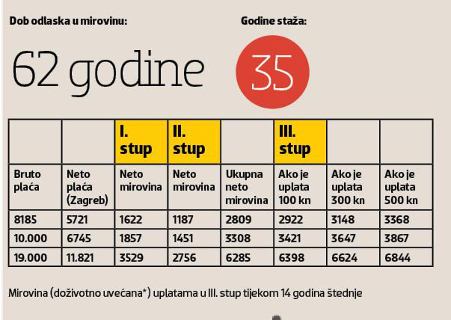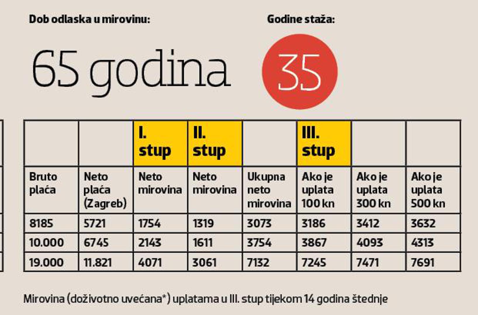 Svim sretnicima koji rade čini se da doprinosi za mirovinu pojedu lavovski dio plaće, dok je, s druge strane, mirovinski sustav uvijek “kratak” za isplate – trenutačno za oko 17 milijardi kuna. Stručnjaci objašnjenje ponavljaju već toliko puta da ga znaju i ptice na grani: pojednostavljenim rječnikom rečeno, rađa nas se i radi premalo da bismo zaradili dovoljno novca za isplatu mirovina starijoj populaciji koja zbog produljenja životnog vijeka sve dulje uživa mirovinu. Mirovine su zato sve niže i jedini su način njihova povećanja u budućnosti vlastite uplate: u III. mirovinski stup, rentno osiguranje ili bilo kakav oblik dugoročne štednje koja se, u vrijeme kad prihodi od plaće presahnu, može “grickati” malo -pomalo, do kraja života.