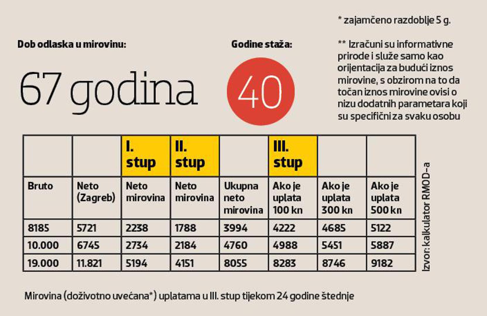 Uzimajući u obzir različite iznose plaća, dob odlaska u mirovinu i eventualne uplate u III. stup ili životno osiguranje te prinose na ulaganje u tu imovinu, stručnjaci iz mirovinskih fondova i osiguranja izračunali su prilično precizno koliko bi mogla iznositi mirovina na nekim tipskim primjerima. Za razliku od mirovinaca, Hrvatski zavod za mirovinsko osiguranje nije sklon davati “tipske” izračune za buduće umirovljenike koji su uplaćivali doprinose samo u I. stup jer im, osim o plaći, mirovina ovisi i o drugim parametrima: poreznim odbicima, korištenju rodiljskih dopusta, pravu na dodatak za uplate u I. stup i sličnom. No, njihova zajamčena minimalna mirovina iznosi 97 posto prosječne starosne mirovine, a ona je u ovom trenutku oko 2230 kuna, odnosno 61,10 kuna po godini staža.