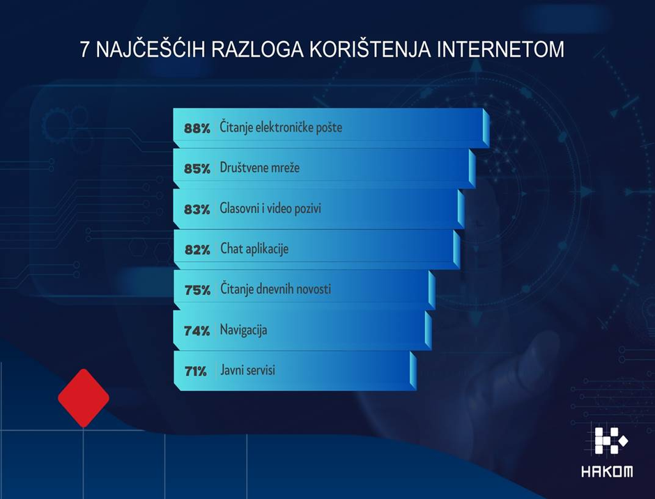Za korištenje interneta u kućanstvu korisnici najvećim dijelom, njih čak 91 posto, koristi kućnu WiFi mrežu, a putem mobilne mreže spaja se 55 posto korisnika. Dominantni uređaji za spajanje na internet su pametni telefoni (95 posto) i prijenosna računala (84 posto), dok stolna računala koristi tek 44 posto ispitanika. Korisnici, njih 88 posto, internetom se najčešće koriste za čitanje elektroničke pošte, 85 posto za praćenje društvenih mreža, a glasovne i video pozive putem interneta ostvaruje 83 posto korisnika. Više od 50 posto ispitanika izjavilo je kako bi u budućnosti željeli koristiti internet za rad na daljinu, a 38 posto njih i za obrazovanje.