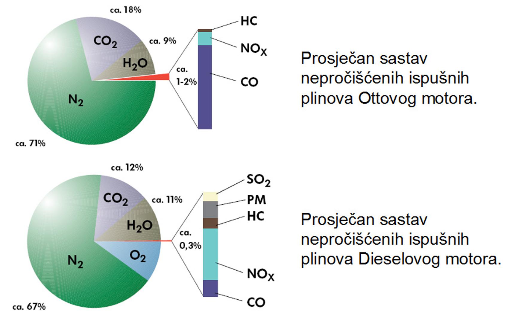 Ako vas to nije nagnalo na razmišljanje, razmislite o tome da emisije ispušnih plinova iz motora s unutarnjim izgaranjem uključuju ovu paletu štete: izgaranjem benzina ili dizelskog goriva u cilindru motora prvenstveno nastaje ugljikov dioksid (CO2), dušik (N2) te ukupno stotinjak drugih kemijskih spojeva. Od svih njih samo su četiri komponente zakonski ograničene, a to su: ugljikov monoksid (CO), neizgorjeli ugljikovodici (CnHm), dušikovi oksidi (NOx) i čestice (PM) odnosno njihov broj (PN).