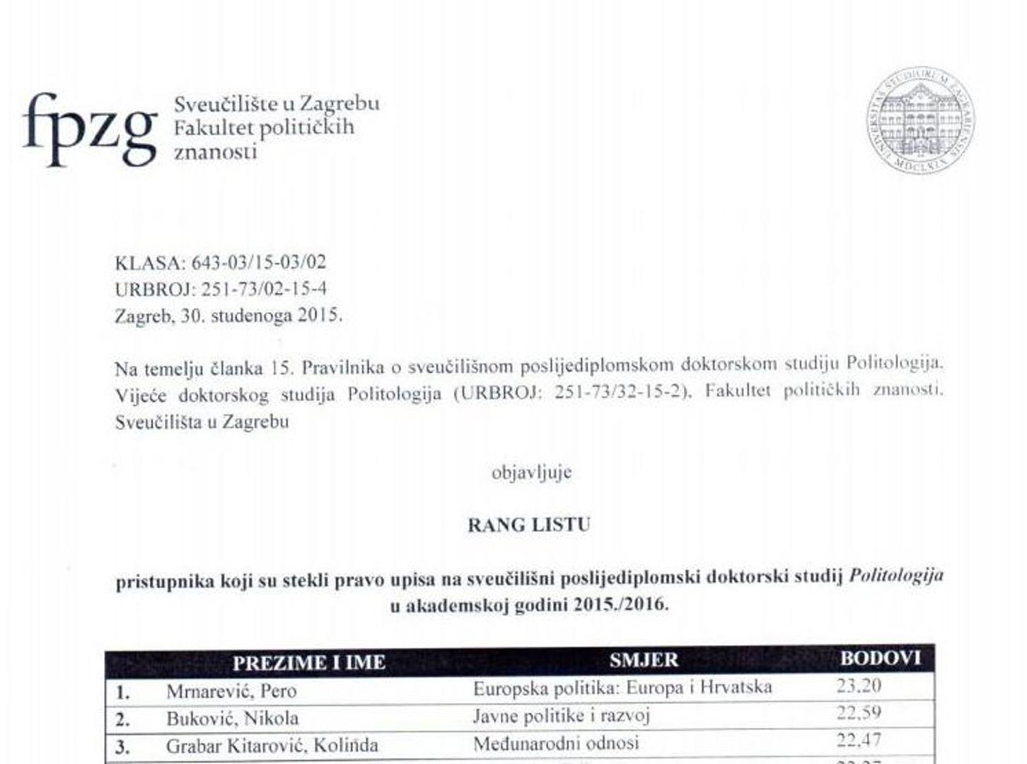 Osim predsjednice doktorski studij na FPZG-u ove godine upisalo je još 37 kandidata.
