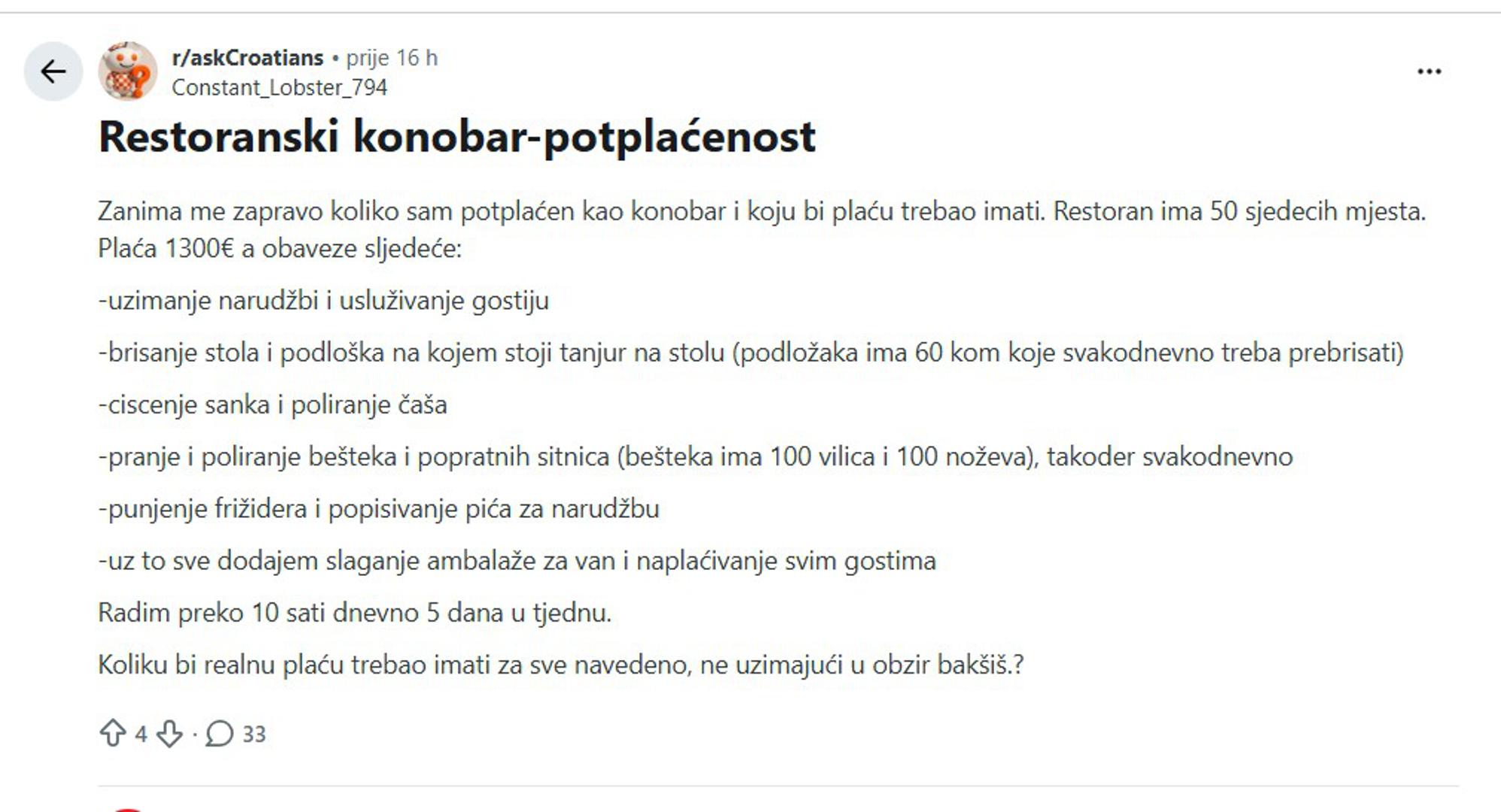 Komentari su se brzo nizali, a velik dio korisnika smatra da je riječ o ozbiljnoj podcijenjenosti rada. Jedan korisnik napisao je da za taj opseg posla i broj sati ne bi pristao raditi ispod 1800 do 2000 eura, dok je drugi dodao kako opisani posao nije samo konobarenje. "Ti si konobar, perač suđa, skladištar i blagajnik u jednoj osobi." Nekoliko komentatora istaknulo je da je posebno problematično to što se dodatni fizički poslovi podrazumijevaju, a nisu posebno vrednovani. "Ako netko uz smjenu mora još satima glancati čaše i brojati zalihe, onda to više nije samo konobarski posao."