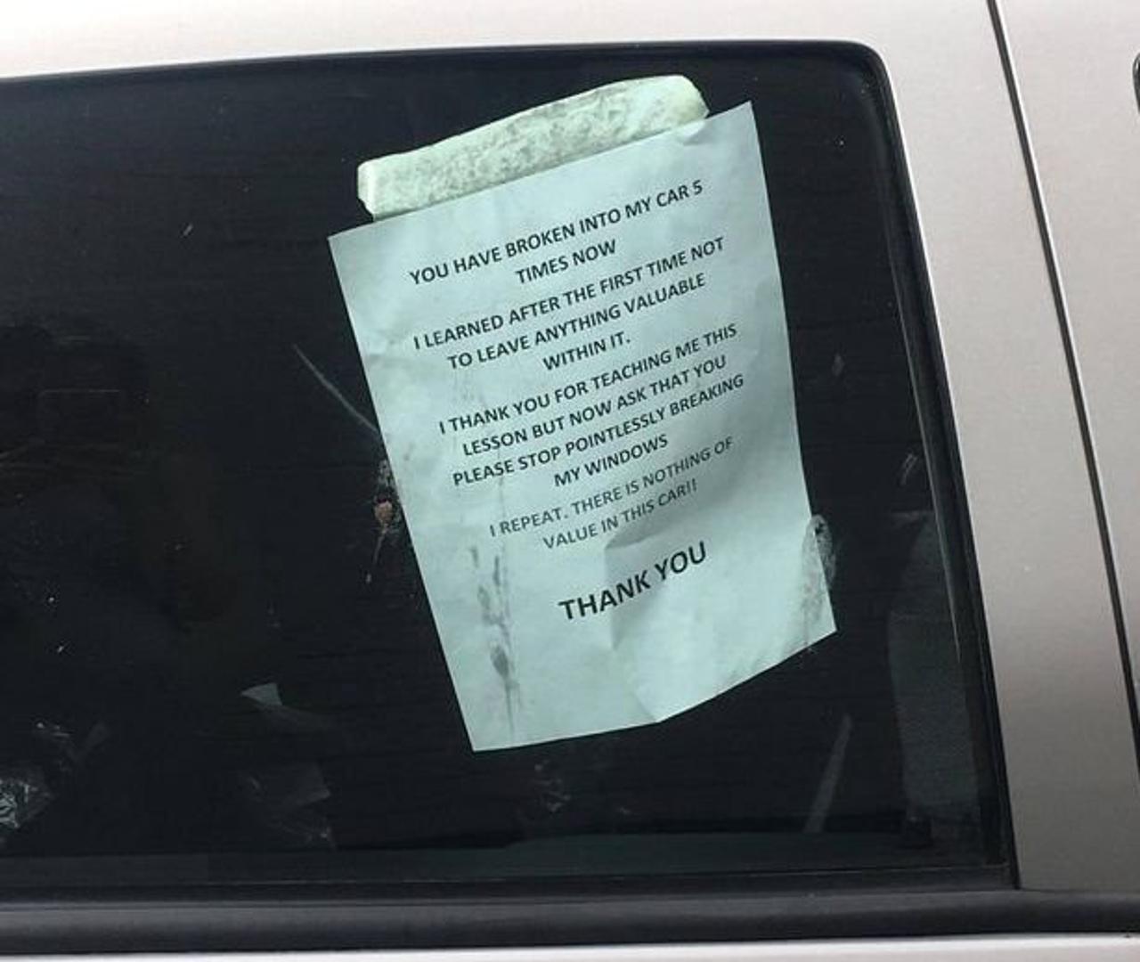 – Provaljivali ste u moj automobil pet puta do sada. Nakon prvog puta naučio sam da u njemu ne držim ništa vrijedno. Hvala vam što ste me naučili lekciju, no sada vas molim da prestanete uzaludno razbijati moje prozore. Ponavljam. U automobilu nema ništa vrijedno – stoji u poruci koja je zalijepljena na prozorsko staklo vozila.