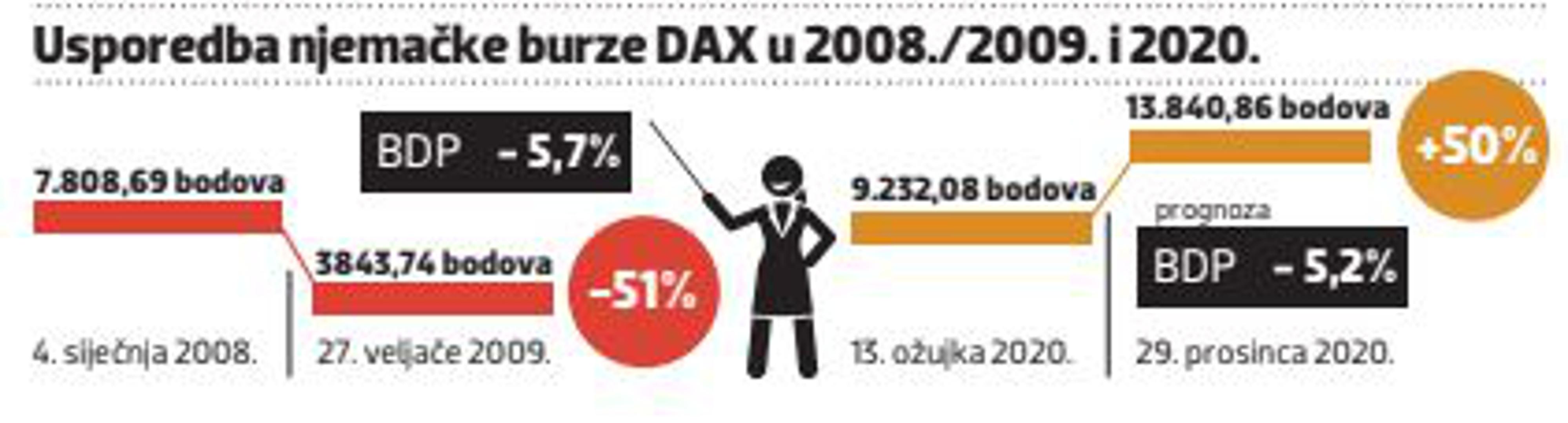 Donekle je slična situacija i u Europi: njemački indeks DAX od početka 2008. do veljače 2009. pao je 51%, a njemački se BDP 2009. srozao za 5,7%. Prema procjenama, 2020. gospodarstvo bi trebalo pasti otprilike kao i 2009., ali su burzovni indeksi od ožujka do danas porasli 50%.