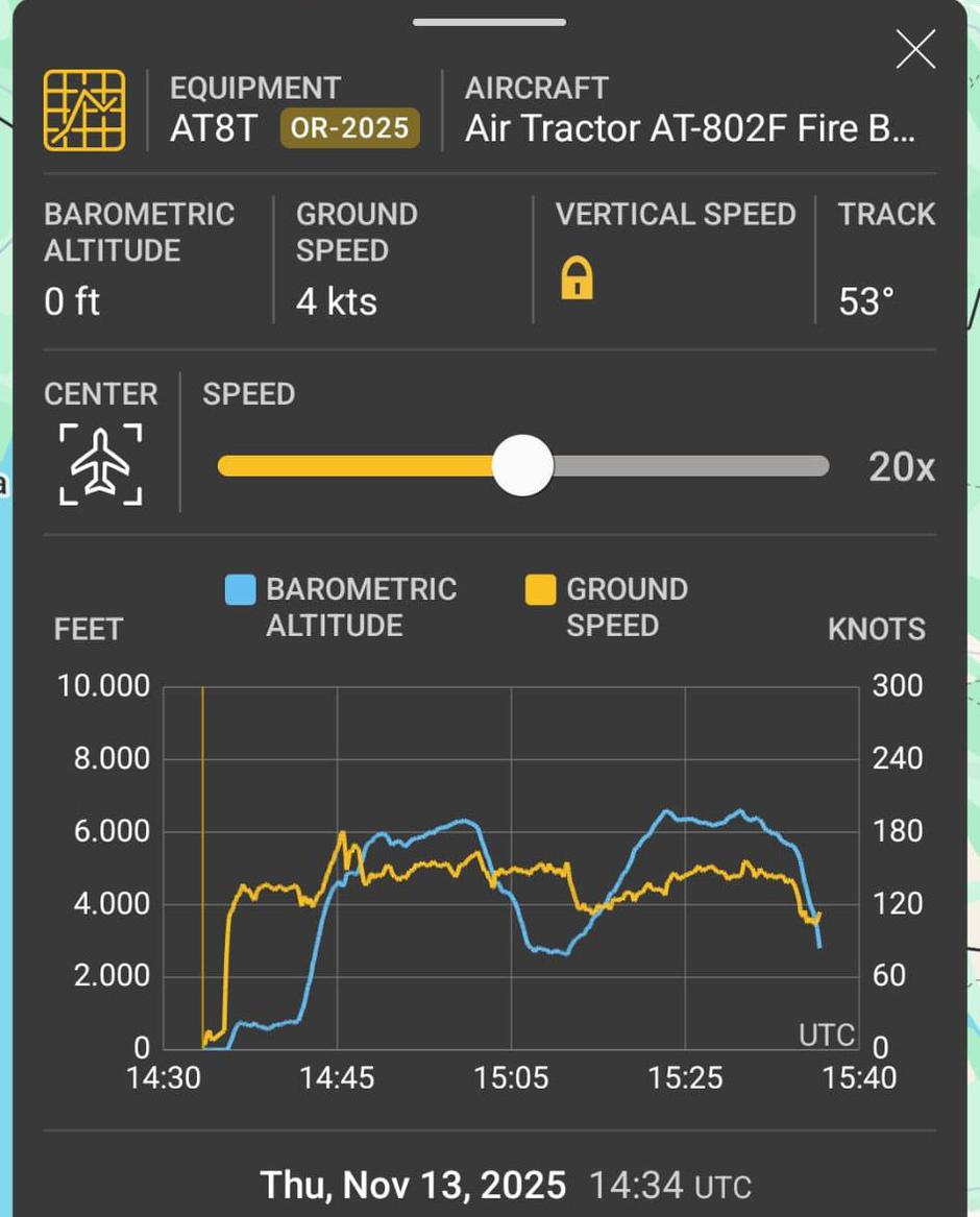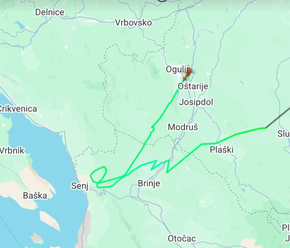 18:42 - Avion je Air Tractor AT-802F Fire Boss registarskih oznaka OR-2025 u vlasništvu turske Uprave za šume. Jučer je, zajedno s još jednim istim avionom, došao iz Tirane na aerodrom Krk. Danas je krenuo u pravcu Zagreba, i okrenuo se nazad, i zadnji detalji leta bilježe nagli gubitak visine.