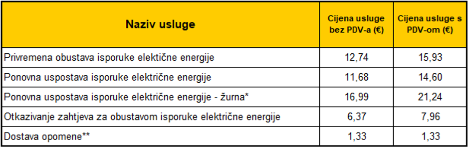 HEP je cijene usluga iskazao i u eurima. Svatko tko privremeno želi obustaviti isporuku električne energije platit će s PDV-om 15,93 eura, dok se ponovna uspostava plaća 14,60 eura. Ako se radi o žurnoj uspostavi, to se plaća nešto više - 21,24 eura. Plaća se, napominje HEP, i otkazivanje zahtjeva obustavom za obustavom električne energije i to 7,96 eura. Ono što brojni ne znaju da se plaća, a to je dostava opomene za poduzetnike i to u iznosu od 1,33 eura.