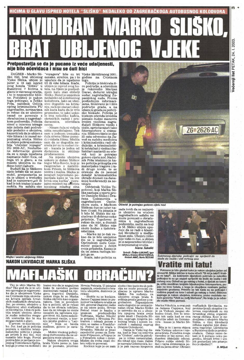 Vjeko Sliško, koji je slovio kao kralj poker automata i vođa jednog zagrebačkog kriminalnog klana, preživio je čak 4 atentata, metke u srce, pluća, bedrenu kost, kičmu, lakat i stopalo, no ne i metak Jamesa Cappiaua. Kada je tog 22. ožujka 2001. izašao iz svog stana u zagrebačkoj Bogovićevoj ulici, na Cvjetnom trgu, belgijski mu je legionar ispalio metak u čelo, a samo par minuta kasnije, Cappiaua je upucao Sliškov tjelohranitelj, Ivica Bertić. Atentat na Vjeku Sliška, bio je peti, a ujedno i posljednji u tom krvavom nizu. No, iako su mnogi tada vjerovali da je upravo ubojstvo Vjeke Sliška kraj krvave spirale mafijaških obračuna na zagrebačkom asfaltu, to je uvjerenje bilo kratkog vijeka. Krv je 2003. godine ponovo prolivena, također u Zagrebu, a žrtva je ponovo bio Sliško. Stariji brat ubijenog Vjeke, 52-godišnji Marko Sliško, ubijen je na današnji dan, 23. siječnja, nešto iza 18 sati, ispred svog hotela "Sliško", u Bunićevoj 7, na čijem je posljednjem katu i stan obitelji Sliško. S lica mjesta tada je detaljno izvještavala Večernjakova novinarka, Ivana Jakelić, a u članku koji je sačuvan u našoj arhivi navodi se kako je Sliško bio ustrijeljen iz vatrenog oružja, ubojica je u njega pucao iz neposredne blizine, a hici ispaljeni u glavu bili su kobni. Počinitelj je pobjegao, a uz automobil 'Chrysler Voyager', u krvi je ostalo ležati mrtvo tijelo Marka Sliška. Pretpostavljalo se da je ubijen u trenutku kad je namjeravao ući ili kada je tek izašao iz svog automobila.