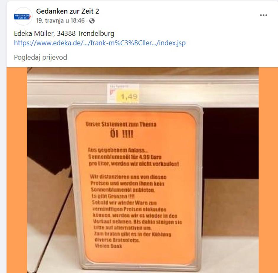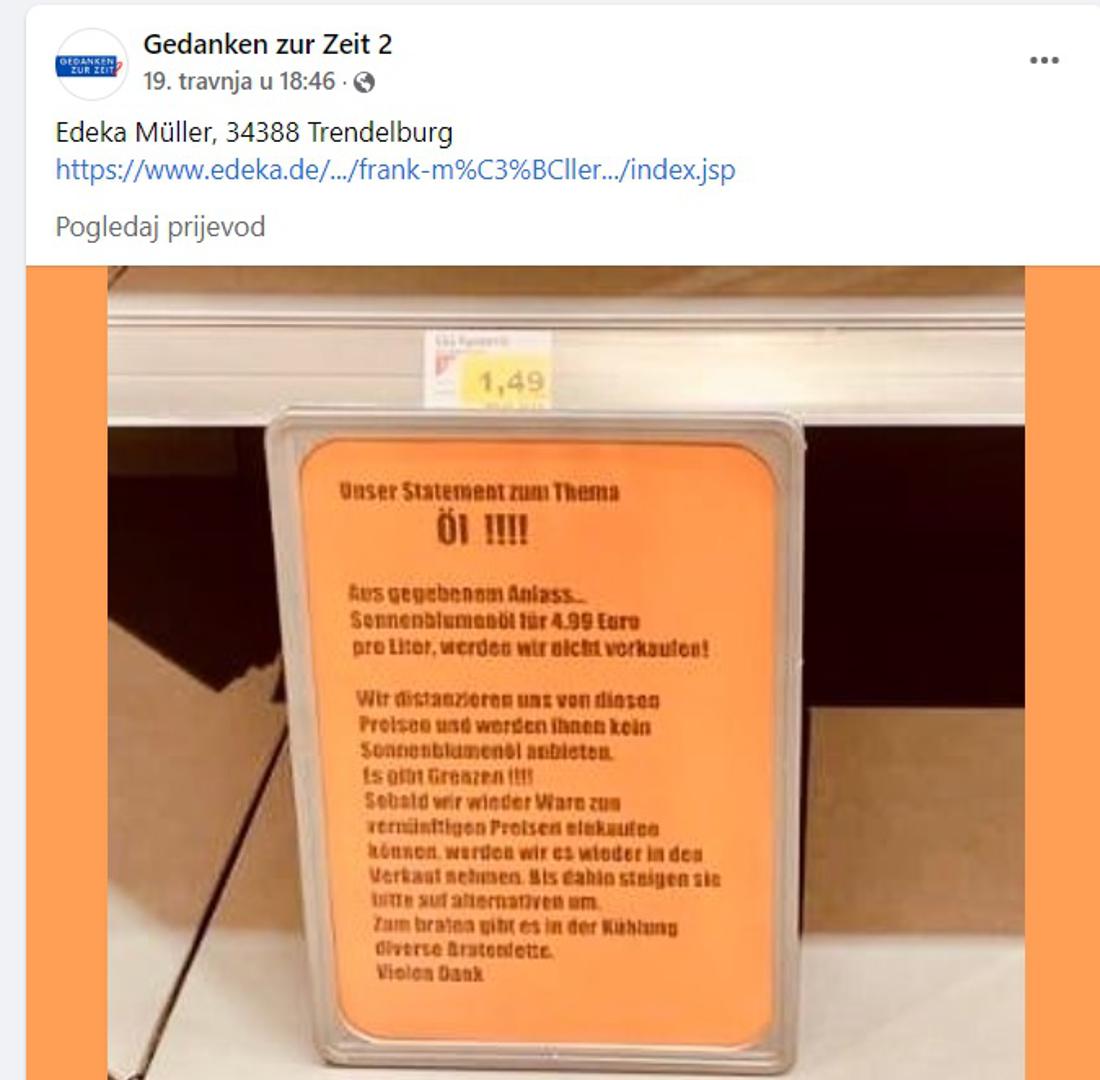 – Nismo očekivali da će se situacija razviti u smjeru u kojem se razvila. Na policu s uljem postavili smo natpis s objašnjenjem zašto više ne prodajemo ulje. Nećemo prodavati suncokretovo ulje za 4,99 eura po litri. Ograđujemo se od ovih cijena. Postoje granice! – rekla je voditeljica trgovine Anja Müller za njemački RTL te dodaje kako su kupci dobro reagirali na njihov potez.