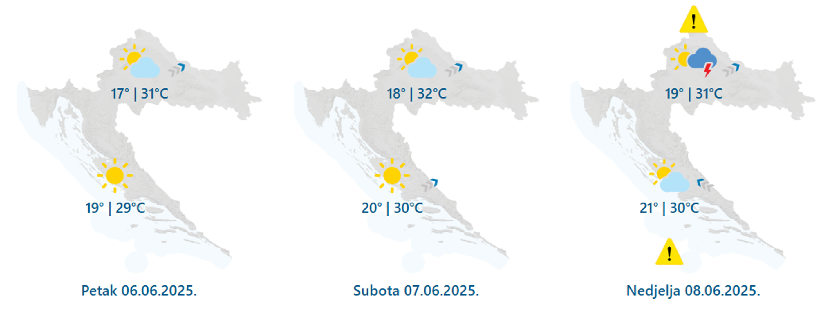 "Do nedjelje nastavak ljetnog ugođaja – pretežno sunčanog i vrućeg. I veći dio nedjelje proteći će uz obilje sunčanih sati i jačanje jugozapadnjaka. Potkraj dana i u noći naoblačenje sa sjeverozapada uz kišu, često i u obliku pljuskova s grmljavinom, moguće i izraženijima, nakon čega će i osjetno osvježiti. I na Jadranu, osobito u Dalmaciji, do kraja tjedna prevladavat će sunčano i vruće. Na sjevernom dijelu potkraj nedjelje porast naoblake, zatim mjestimice pljuskovi i grmljavina, moguće izraženiji. Puhat će slab do umjeren jugozapadni vjetar i jugo, u nedjelju u jačanju, a u noći na ponedjeljak na sjevernom će dijelu zapuhati bura", prognozirala je za HRT Dunja Plačko-Vršnak, dipl. ing. iz DHMZ-a.