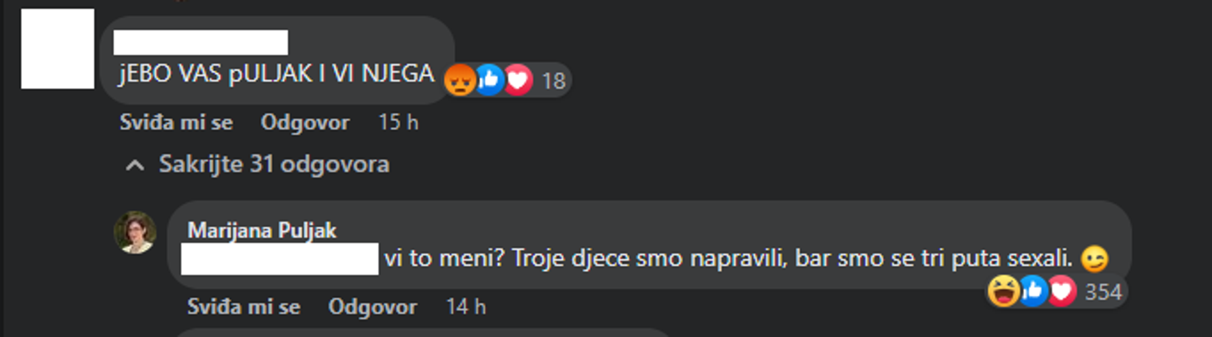 - Poštovana gospođo, nisam ja otkrivala temu svog seksualnog života nego nepoznati gospodin koji je mislio prizemno vrijeđati. A ako sam i Vama otkrila da sam do sad najmanje tri puta općila s vlastitim suprugom, pored troje žive i zdrave djece, onda možda niste bili redovni na satu biologije u osnovnoj školi - poručila je Puljak.