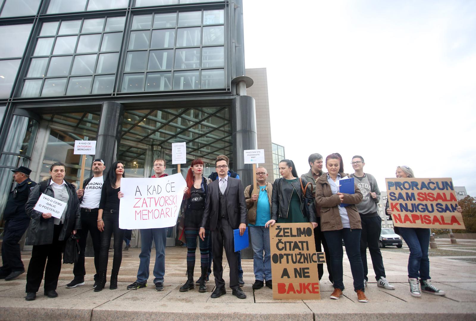 Ispred NSK okupili su se prosvjednici s transparentima poput "Proračun sam sisala, knjigu sam napisala" i "A kad će zatvorski memoari?". Među prosvjednicima je bio aktivist Ivan Pokupec (na slici ispod u sredini u odijelu), koji je ranije ove godine sudjelovao u gađanju sjedišta HDZ-a te Ministarstva zdravstva jajima u znak prosvjeda zbog smrti Mattea Ružića u Zaprešiću,