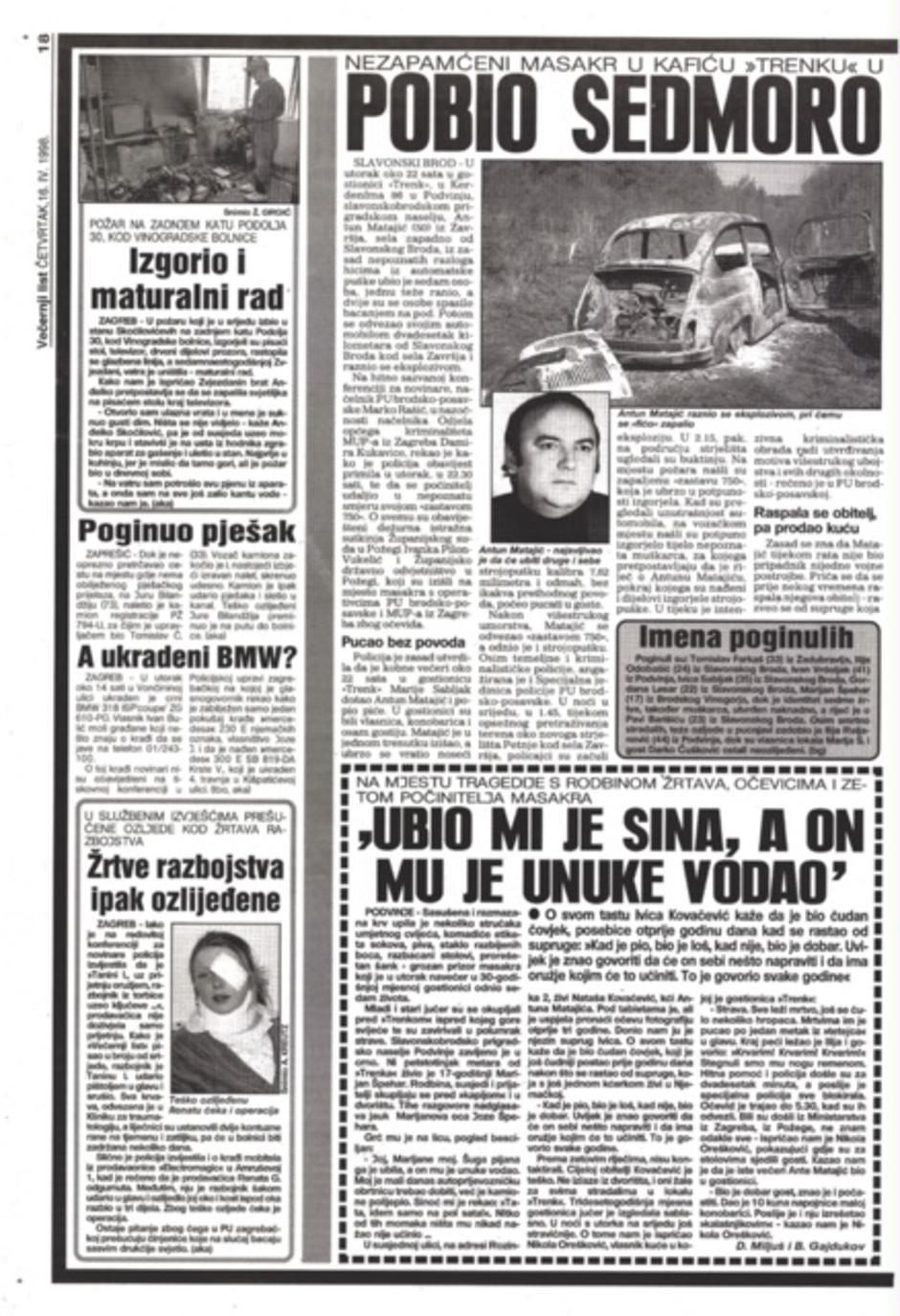 Ma koliko se trudili da zaborave, krvoproliće, koje se dogodilo tog kobnog, 14. travnja 1998., Brođani i danas dobro pamte. U Večernjakovoj arhivi pronašli smo članak o tom nesretnom događaju. Dan je već bio na izmaku kada se 50-godišnji Antun Matajić, iz sela Završje, kod Slavonskog Broda, fićom dovezao u Podvinje. Oko 22 sata ušao je u mjesni kafić, 'Trenk', u kom je, prije par sati, već bio s prijateljem, na piću. U lokalu su ga svi dobro poznali, jer je, na toj adresi bio čest i redovan gost.