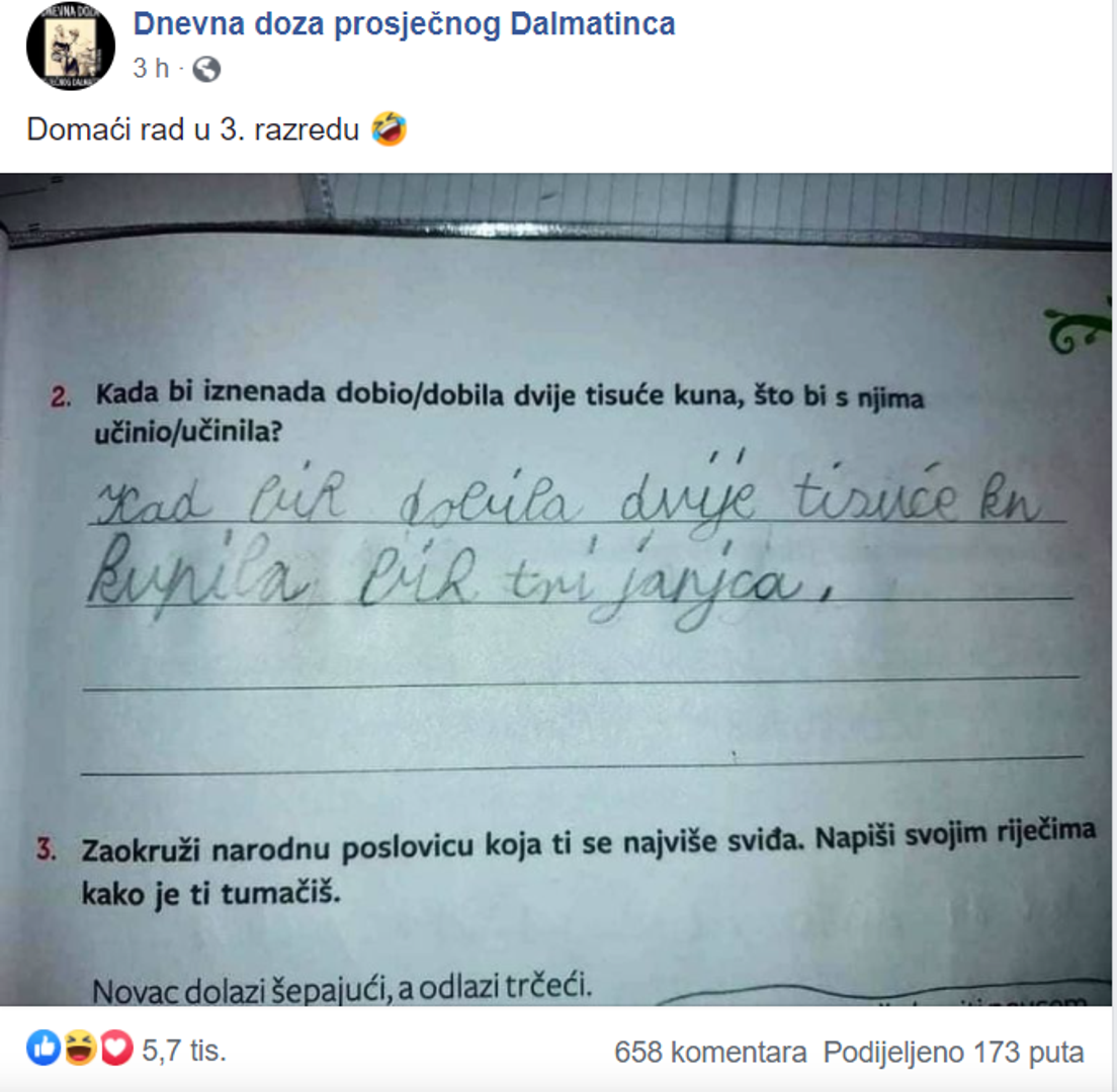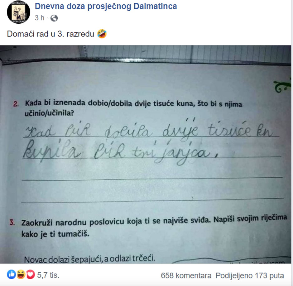 Zabavna Facebook stranica ''Dnevna doza prosječnog Dalmatinca'' objavila je u četvrtak fotografiju domaćeg rada učenice trećeg razreda.